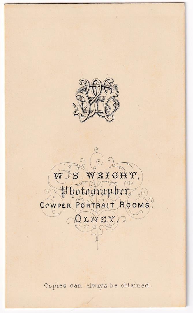 Photo was taken by W.S Wright, a photographer in Olney, Buckinghamshire at the Cowper Portrait Rooms. 1860's-1880's.