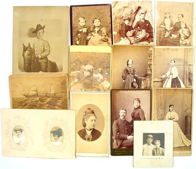 Lot of thirteen CDV photos from Europe. Most are from London, Belfast and Glasgow with signatures and dates to versos of some. Images depict a variety of men, women and children, posed together and individually with one image of a ship in choppy waters. Photos are very good to near fine overall.