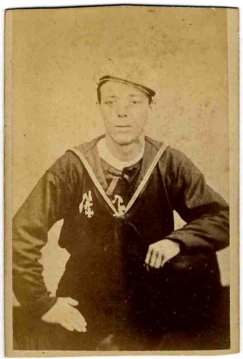 CDV of sailor, ca. 1880, dressed in full uniform, poses on bended knee with a contemplative expression on his face and an embellished medal pinned to his chest. Photographed from the lap. Image slightly trimmed at top and bottom. No backmark. Very good condition.