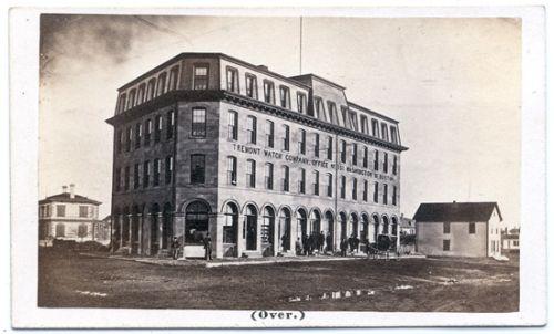 Carte de visite with full advertising back. The building has a large sign for their office at 331 Washington Street in Boston, but this may be their factory in Melrose (the agents listed on the back have their offices at 12 West Street.) [4-]