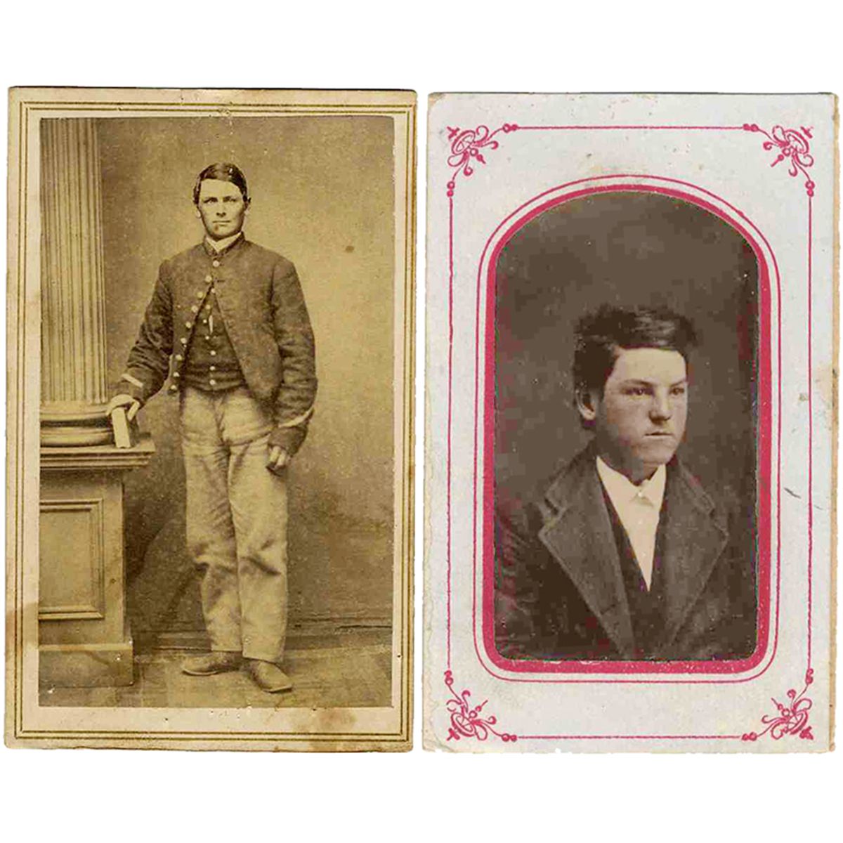 CDV and tintype of Civil War soldier. Tintype is a portrait of a young man with disheveled hair and an innocent expression. He is pictured from the chest-up in a sitting position. CDV shows same man in full uniform with stripe on his right sleeve, standing upright. He wears a stripe on his right sleeve. No backmark present. Both images in excellent condition, illustrating transition from civilian boy to military man.