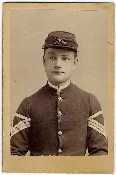 CDV, ca. 1870's, of a young, fresh-faced soldier. Photographed in a sitting position, he is shown from the chest up in full uniform. Backmark reads: ''New York Gallery, 1144 Market St., San Francisco.'' Also written in ink on the back is, ''G. H. Howland, 3rd Sergeant & Quartermaster.'' Measures 2'' x 3'' and is in good condition with no major flaws. Lovely photograph.