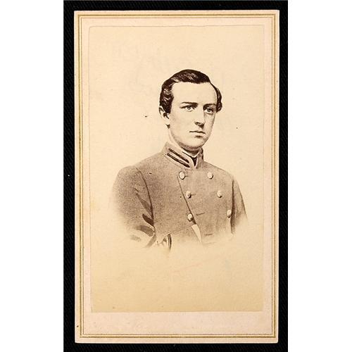 <Our item number 140261><B>Carte-de-Visite Photograph of An Identified Confederate Soldier.</B> Confederate Lt. Joseph Selby is pictured from the chest up, with his right hand tucked into his jacket. Selby enlisted in the 21st Virginia Infantry, "B" Co., on 23 May 1861 and served with that regiment until 23 May 1862, when he was mustered out at Fort Royal. He was described as 5'10.0", brown eyes, light hair, and born in Annapolis, MD. In the interim, the regiment was under the command of Loring, serving in the Army of the Northwest and in the Valley with the Army of Northern Virginia. This same image appears in Albaugh's "Confederate Faces," p. 128. No backstamp. Near fine condition. <BR>Estimated Value $400 - 600. <BR><BR>Our item number 140261<BR><IMAGES><P ALIGN="CENTER"><IMG SRC="http://www.goldbergcoins.net/liveauction/49jpegs/140261.jpg"> </P></IMAGES>