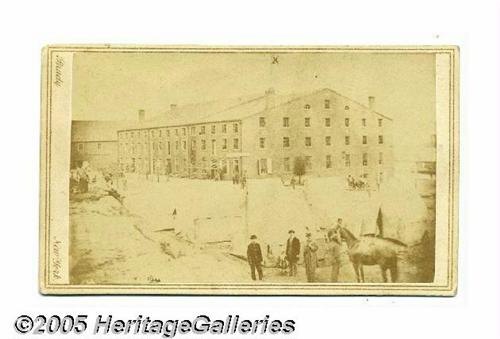 <B>CDV of the Infamous Libby Prison</B></I> A scarce, early study of the infamous Confederate Libby Prison, Richmond, Virginia before the first floor was whitewashed, with Civil War troops camped out in the foreground. A carte by Brady, his "curved imprint" on verso. A bit light, one small mark, while available in stereoview format, as a CDV quite rare. Lot:251