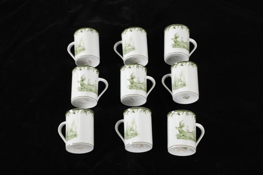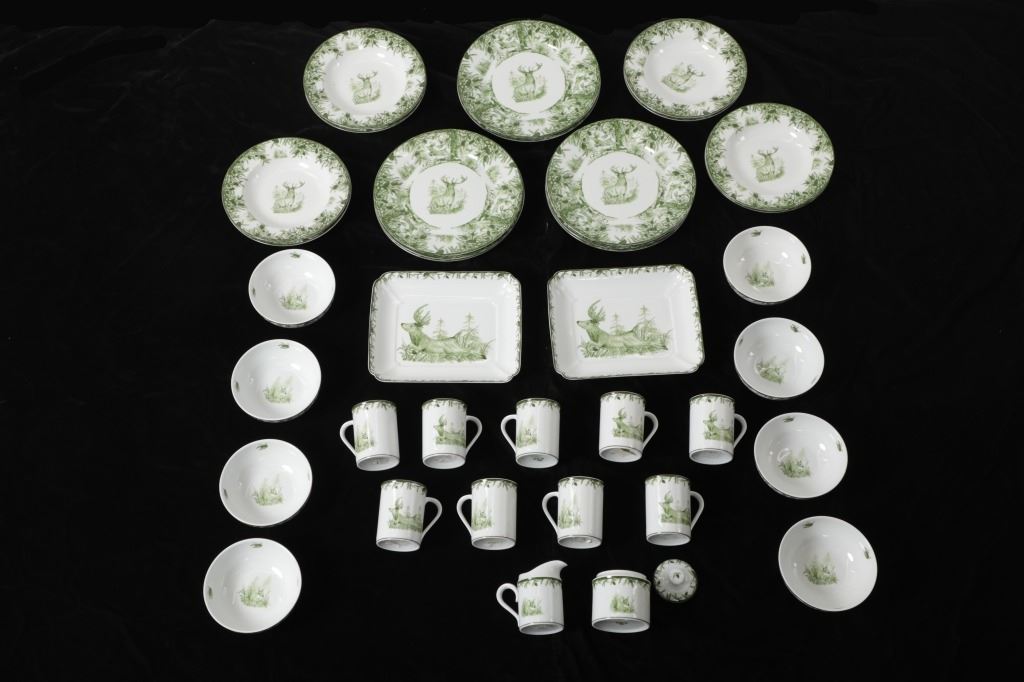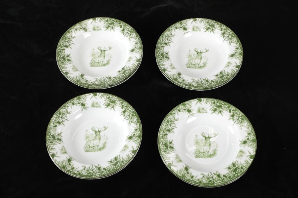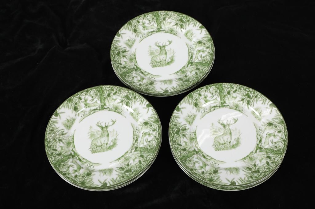 Featured in this lot are CE Corey Forest pattern Handpainted China, Portugal. A high-fired, handmade porcelain collection features a forest scene of a proud buck standing tall amidst pinecones in tones of green and will bring to life any table setting.
