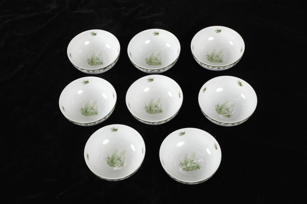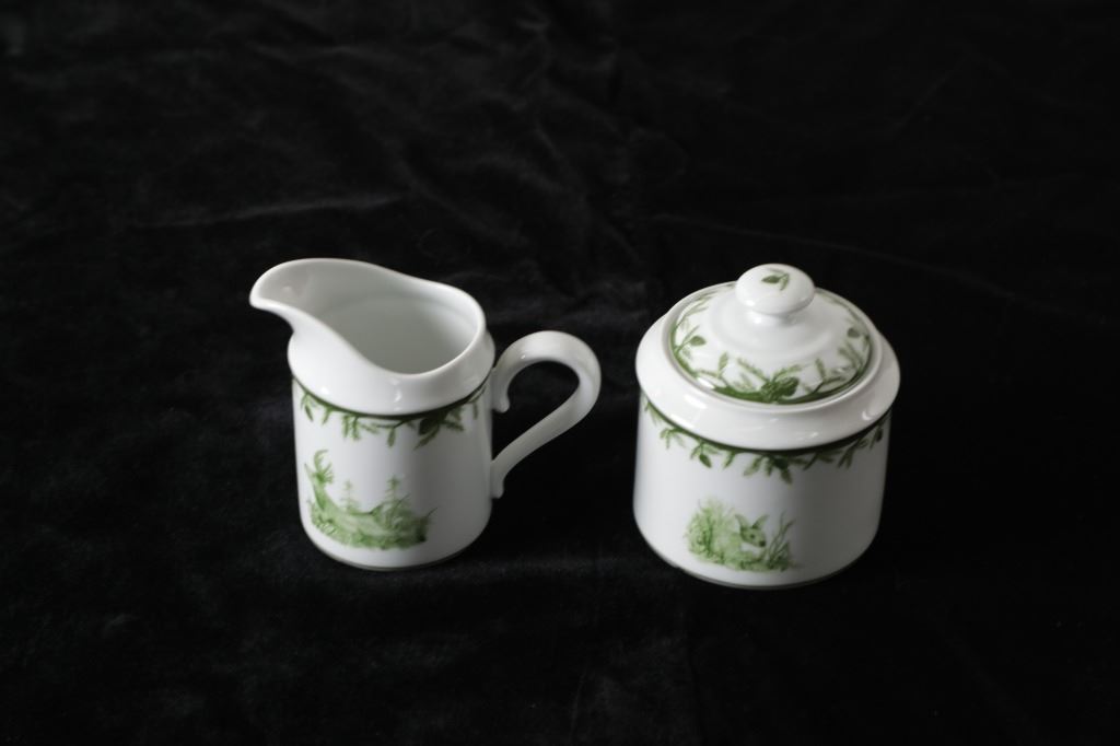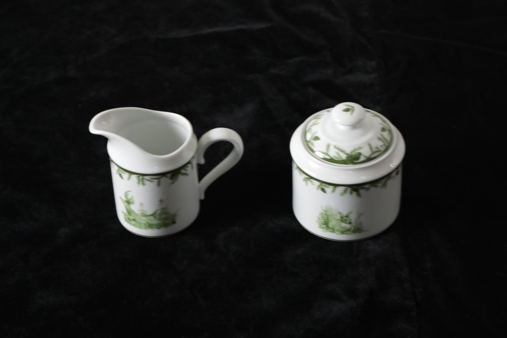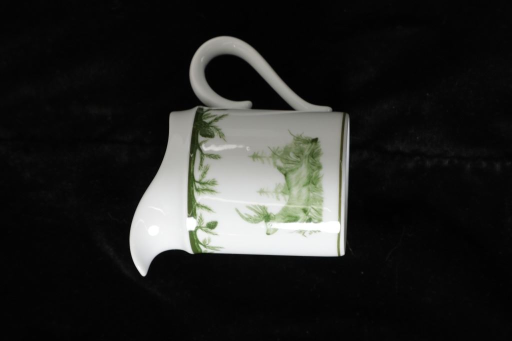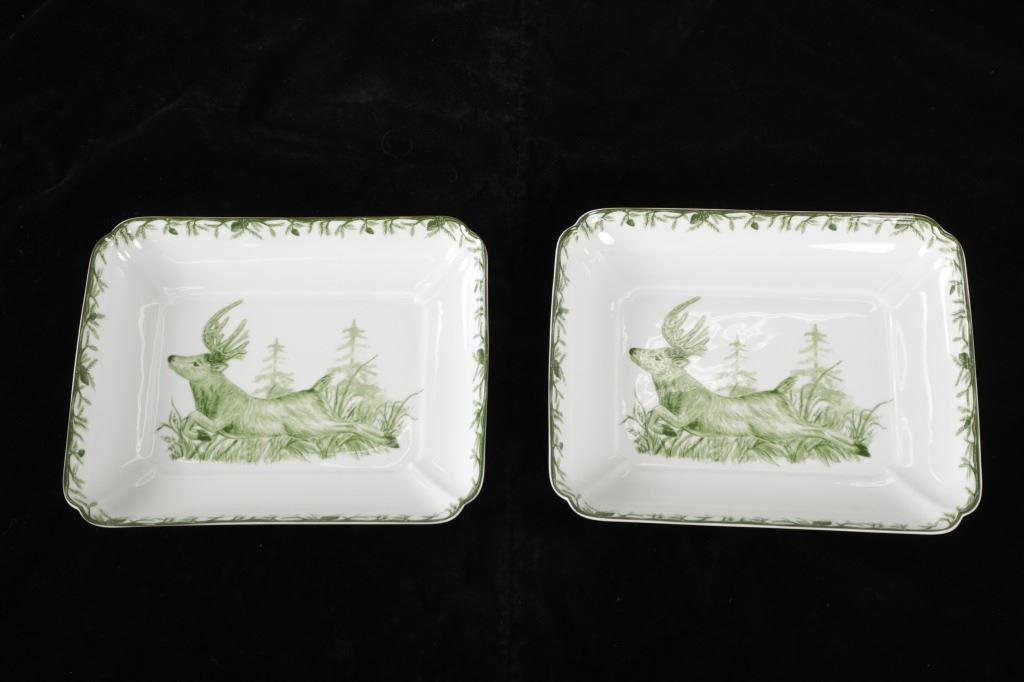 Featured in this lot are CE Corey Forest pattern Handpainted China, Portugal. A high-fired, handmade porcelain collection features a forest scene of a proud buck standing tall amidst pinecones in tones of green and will bring to life any table setting.