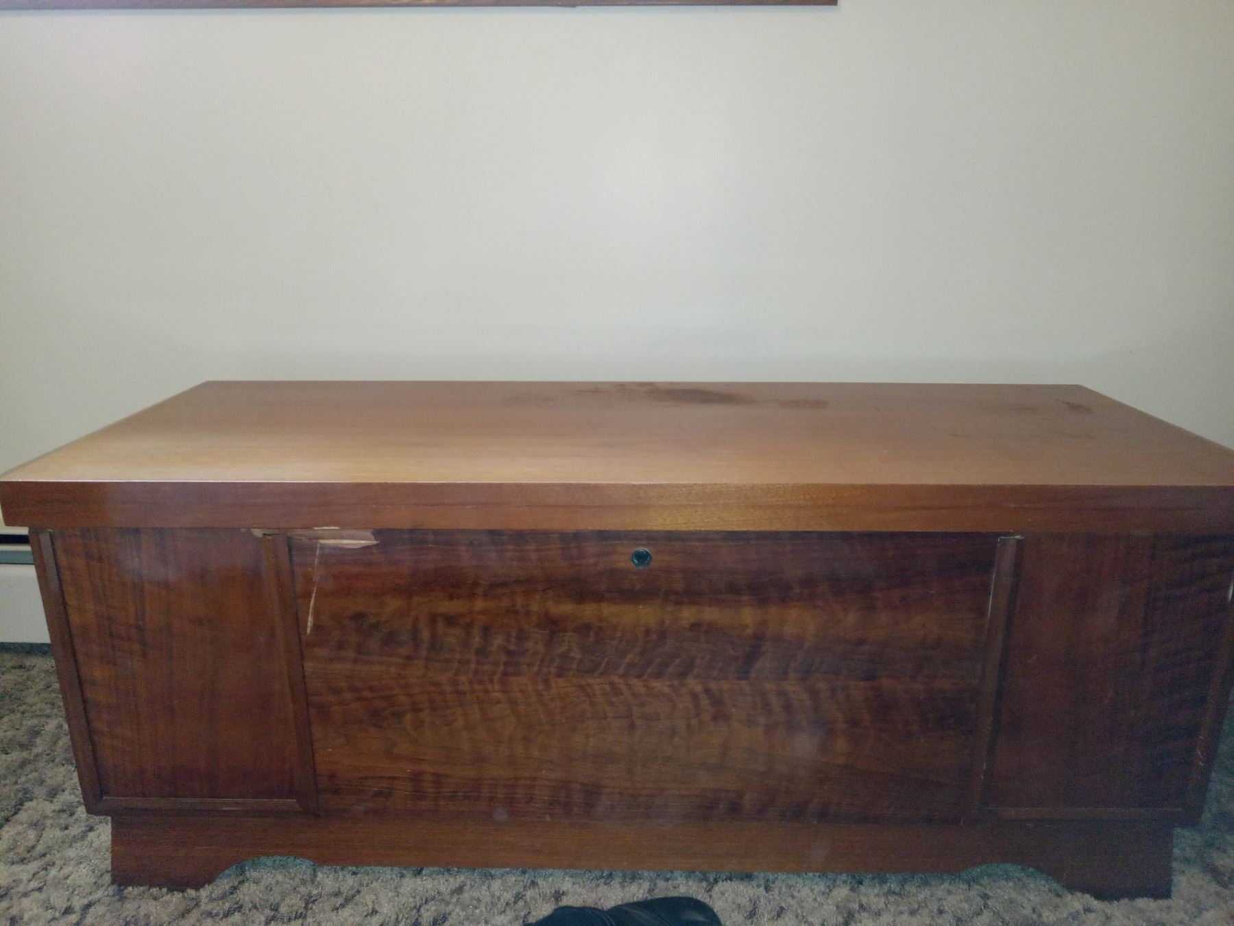 CEDAR CHEST w/ LINENS. SMALL DAMAGE ON FRONT (SEE IMAGES).
