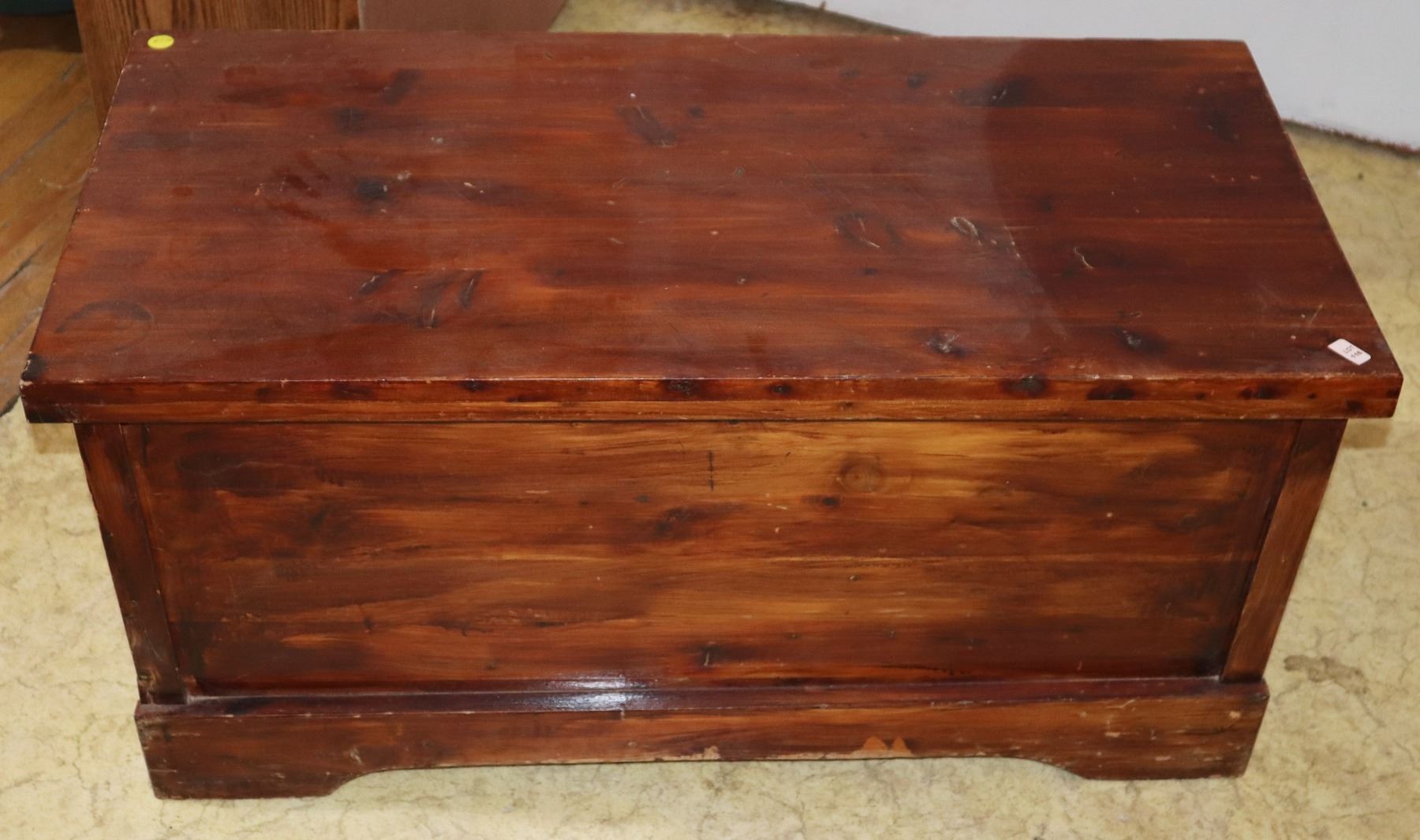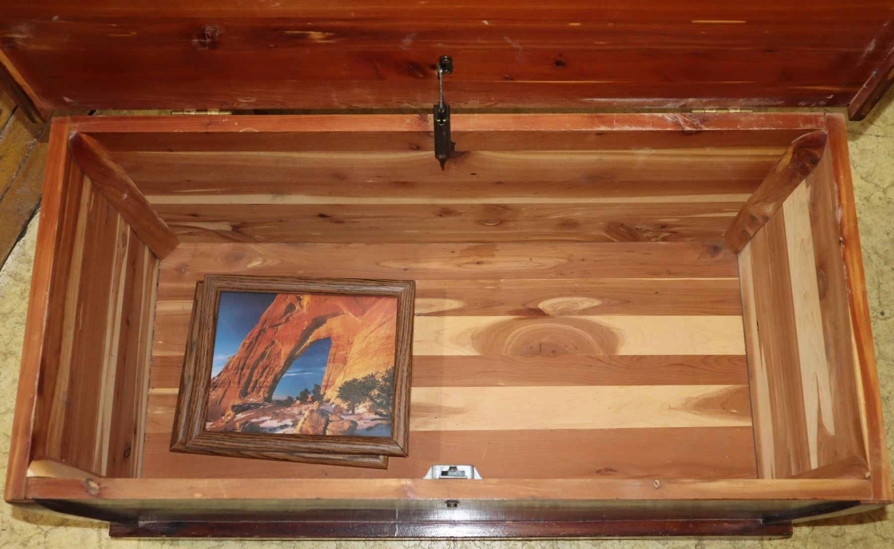 APPROX 35" X 17" X 17" TALL. INCLUDES A COUPLE FRAMED PICTURES INSIDE