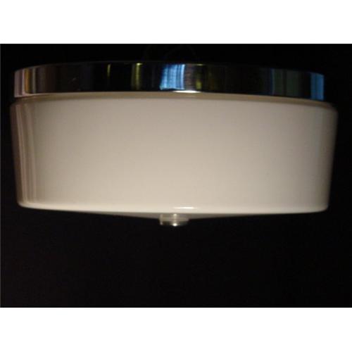 A drum form nickelplated ceiling fixture with milk glass lens. Diameter 12 1/2" drop 5".Two available.NYS