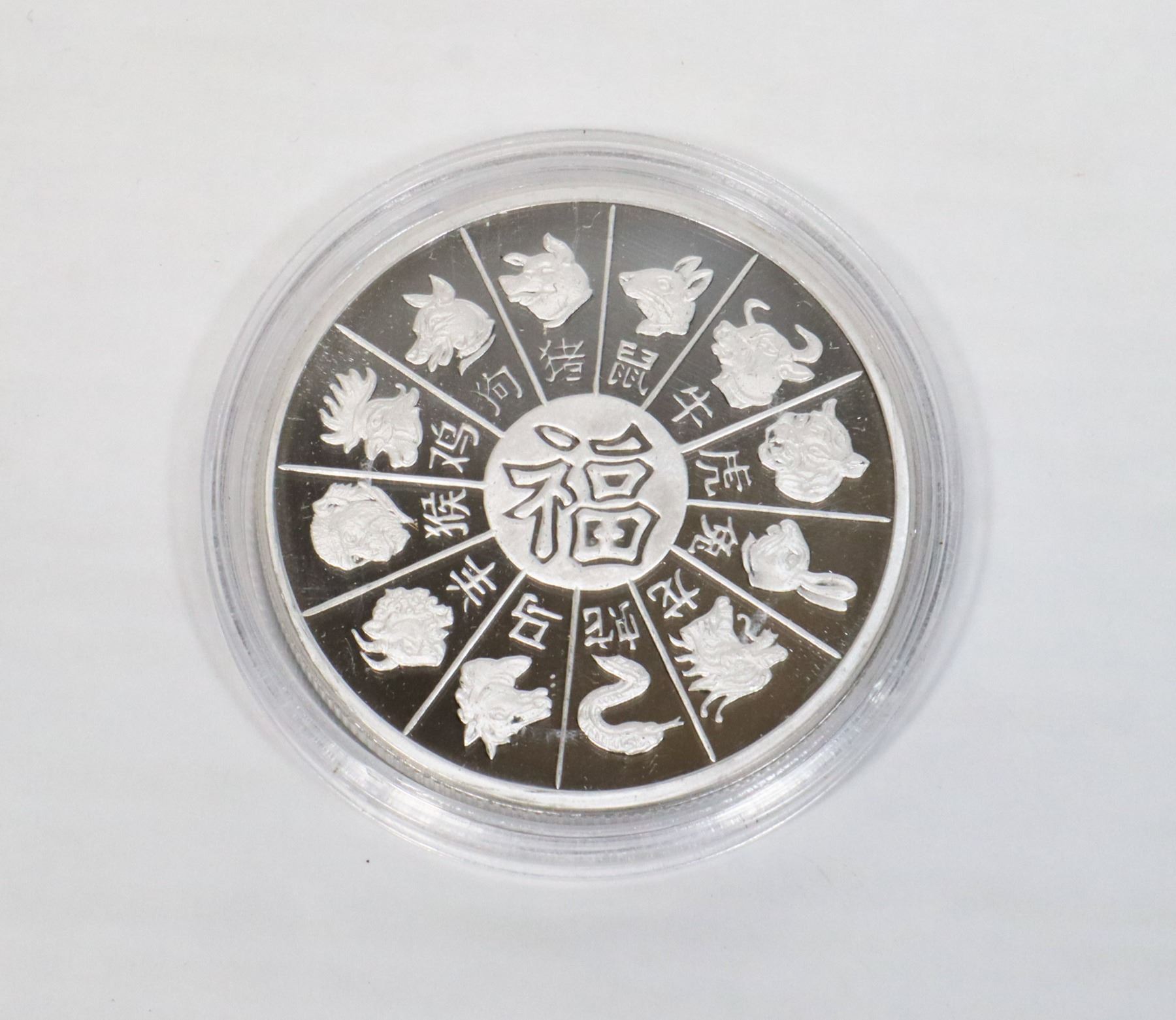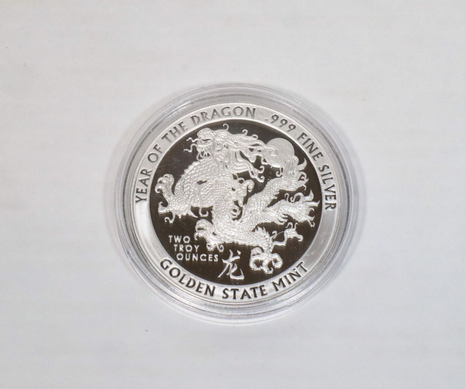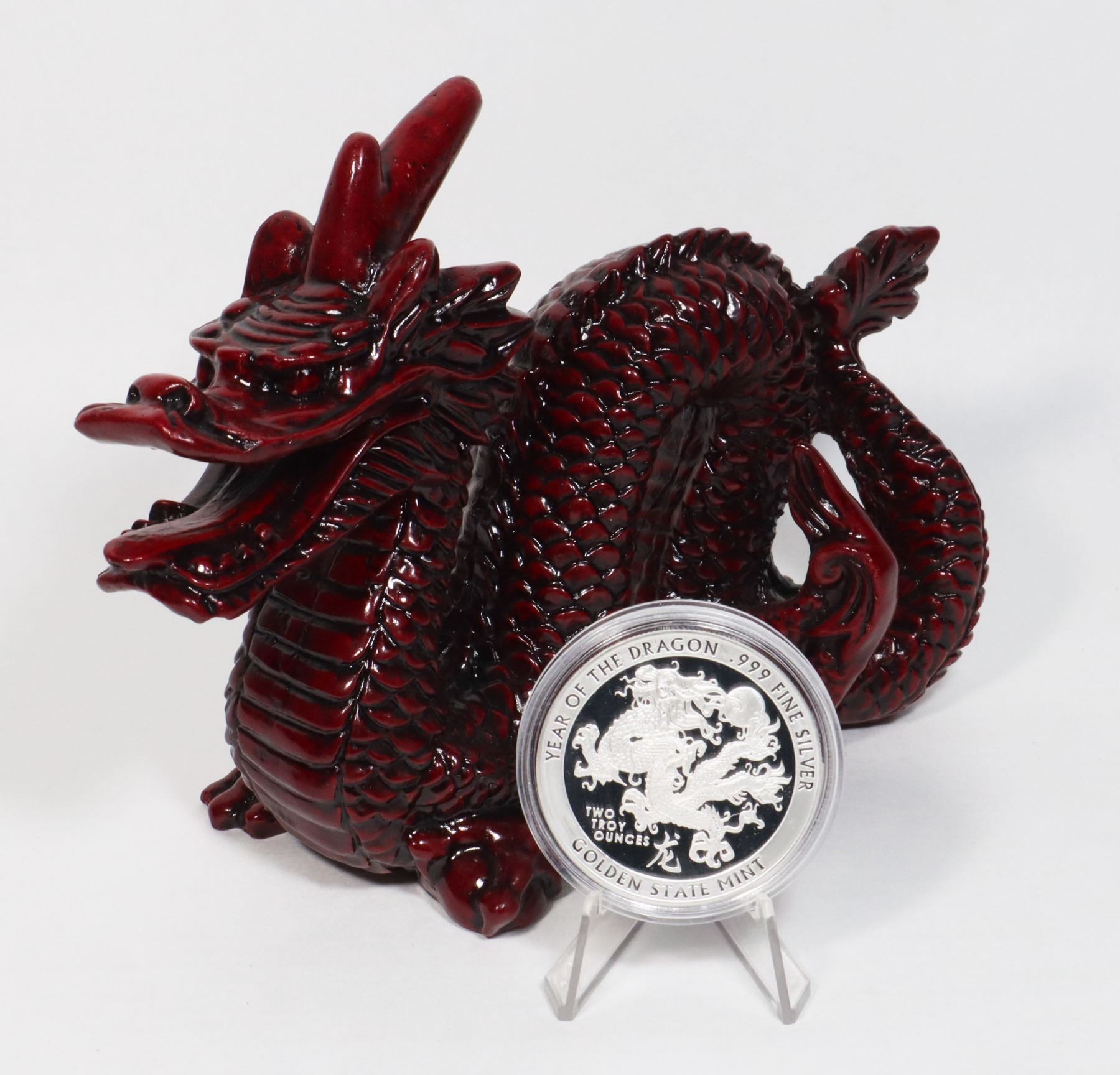 MAGNIFICENT 2-OZ YEAR OF THE DRAGON SILVER ROUND. PROOF LIKE, LARGE 47MM DIAMETER IN CAPSULE WITH BEAUTIFUL DRAGON STATUE