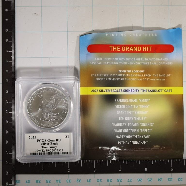 EAGLE TYPE 2 PCGS GEM BU. SIGNED BY "TOM GUIRY" CHASE THE GREAT BAMBINO WITH ORIGINAL ENVELOPE, FROM THE MOVIE "SANDLOT" THIS IS ONE OF THE ACTORS IN THE MOVIE. LIMITED EDITION PIECE ON A TYPE 2