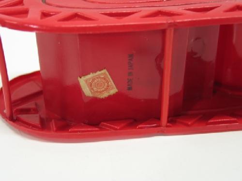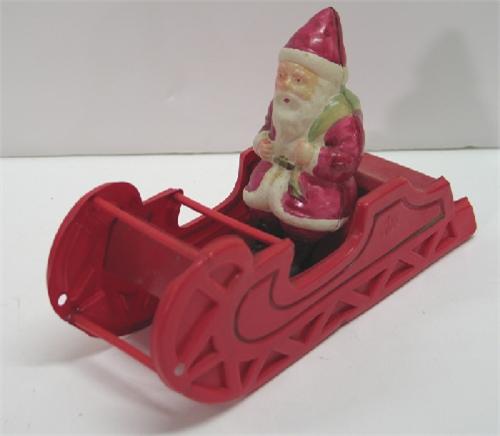 CELLULOID SANTA AND SLEIGH. Depicts Santa sitting in red sleigh. Marked on bottom “Made in Japan”. Sleigh is impressed “Japan” at sides and Santa is impressed “Japan” at back. 6.5” L
