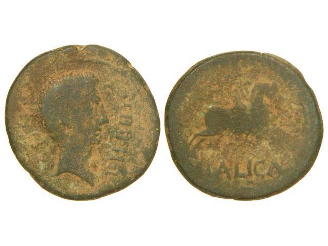 CELTIBERIAN COINS - As. BILBILIS. Anv.: Cabeza de Augusto a derecha, delante (BILBILIS). Rev.: Jinete con lanza a derecha, debajo ITALICA. 15 grs. AB-269. MBC-/BC+.