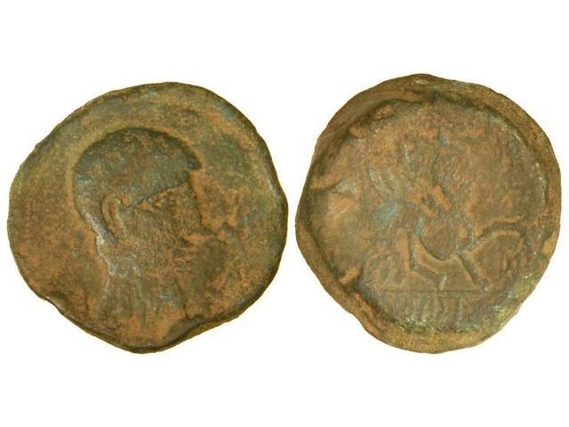 CELTIBERIAN COINS - As. CASTULO. Anv.: Cabeza masculina diademada a derecha. Rev.: Esfinge a derecha, delante (estrella) y letra ibérica Co, debajo leyenda, bajo línea. 32 grs. Pátina verde. AB-697. MBC-/BC+.