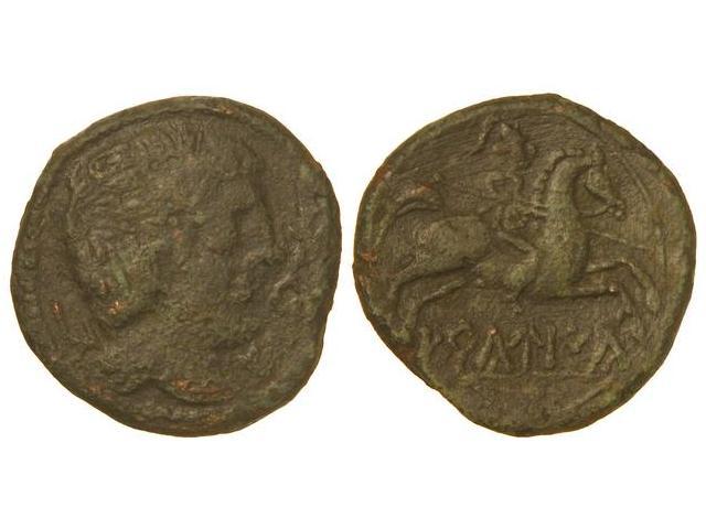 CELTIBERIAN COINS - As. ERCAVICA. Anv.: Cabeza masculina a derecha, detrás arado, delante signos ibéricos ER. Rev.: Jinete con lanza a derecha, debajo leyenda ibérica. 12,10 grs. Pátina oscura. AB-1275. MBC-/MBC.