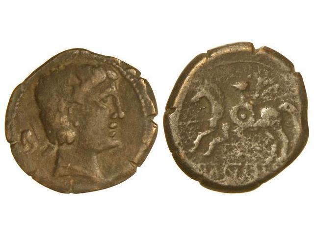 CELTIBERIAN COINS - As. ICALCUSCEN. Anv.: Cabeza masculina a derecha, detrás delfín. Rev.: Jinete con lanza y rodela a izquierda, debajo sobre línea leyenda ibérica. 7,80 grs. AB-1399. MBC-.