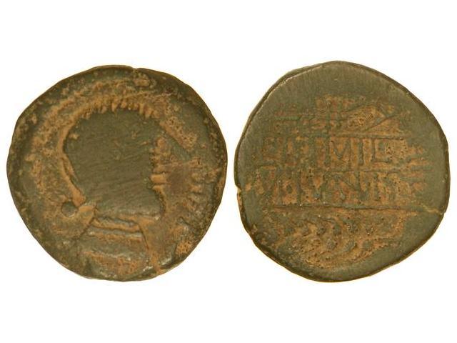 CELTIBERIAN COINS - As. OBULCO. Anv.: Cabeza femenina a derecha, delante (OBVLCO). Rev.: Arriba arado a derecha, debajo espiga a izquierda, en medio leyenda. 13,80 grs. Pátina verde. AB-1807. MBC-.