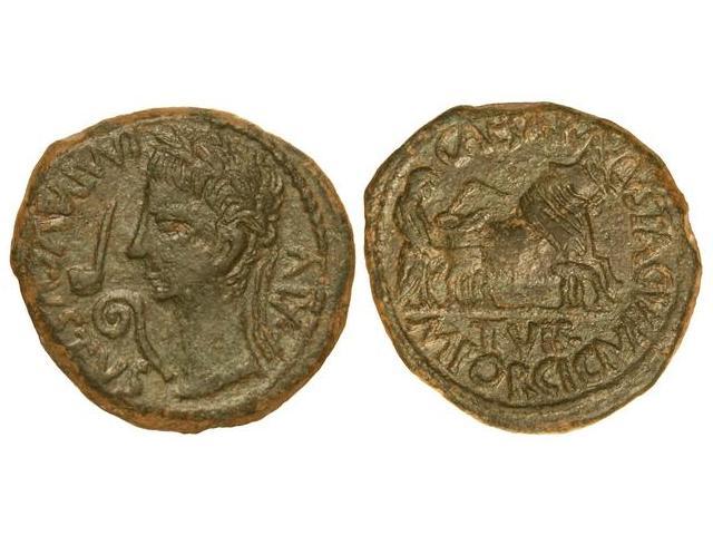 CELTIBERIAN COINS - As. ÉPOCA DE AUGUSTO. CAESAR AUGUSTA. Anv.: IMP. AVGVSTVS XIV. Cabeza laureada de Augusto a izquierda, delante lituo y símpulo. Rev.: CAESAR AVGVSTA M. PORCI. C.N. FAD. II VIR. Yunta a derecha. 13,80 grs. Pátina verde. MAGNÍFICO EJEMP