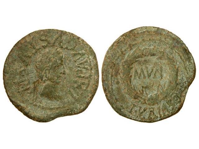CELTIBERIAN COINS - As. ÉPOCA DE AUGUSTO. TURIASO. Anv.: Cabeza laureada de Augusto a derecha, alrededor IMP. AVGVSTVS P. P. Rev.: Láurea, dentro MVN, debajo TVRIASO. 10,50 grs. Pátina verde. AB-2437. MBC-/MBC.