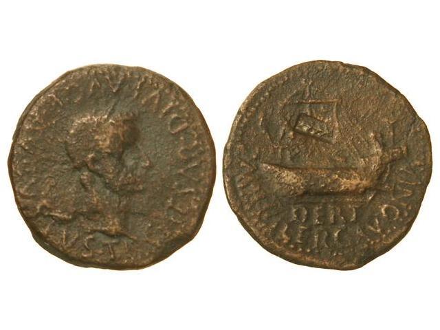CELTIBERIAN COINS - As. ÉPOCA DE TIBERIO. ILERCAVONIA. Anv.: TI. CAESAR DIVI AVG. AVGVSTVS. Cabeza laureada de Tiberio a derecha. Rev.: DERT. M. H. I. ILERCAVONIA. Nave. 6,90 grs. Resello en reverso. AB-1493. BC+/MBC.