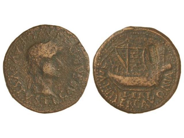 CELTIBERIAN COINS - As. ÉPOCA DE TIBERIO. ILERCAVONIA. Anv.: TI. CAESAR DIVI. AVG. AVGVSTVS. Cabeza laureada de Tiberio a derecha. Rev.: DERT. M. H. I. ILERCAVONIA. Nave. 7,40 grs. Resello en reverso. (Oxidaciones). AB-1493. MBC-/MBC.