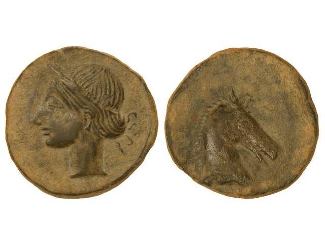 CELTIBERIAN COINS - Calco. CARTAGONOVA. Anv.: Cabeza de Tanit a izquierda. Rev.: Cabeza de caballo a derecha. 8,40 grs. Pátina oscura. (Pequeñas oxidaciones en reverso). AB-514. EBC/MBC+.