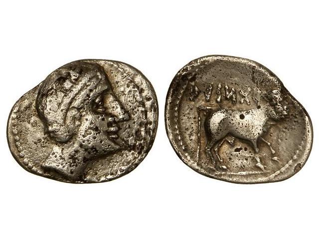 CELTIBERIAN COINS - Dracma. ARSGITAR. Anv.: Cabeza laureada de Hércules a derecha. Rev.: Toro androcéfalo a derecha, encima leyenda ibérica. 2,40 grs. (Metal poroso). RARA. AB-2033. (MBC+).