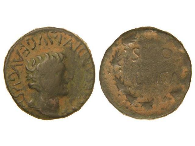 CELTIBERIAN COINS - Semis. ÉPOCA DE TIBERIO. SEGOBRIGA. Anv.: TI. CAESAR DIVI AVG. F. AVGVS. F. (IMP.). Cabeza descubierta de Tiberio a derecha. Rev.: SEGOBRIGA dentro de láurea. 7,10 grs. Pátina verde. BC+.