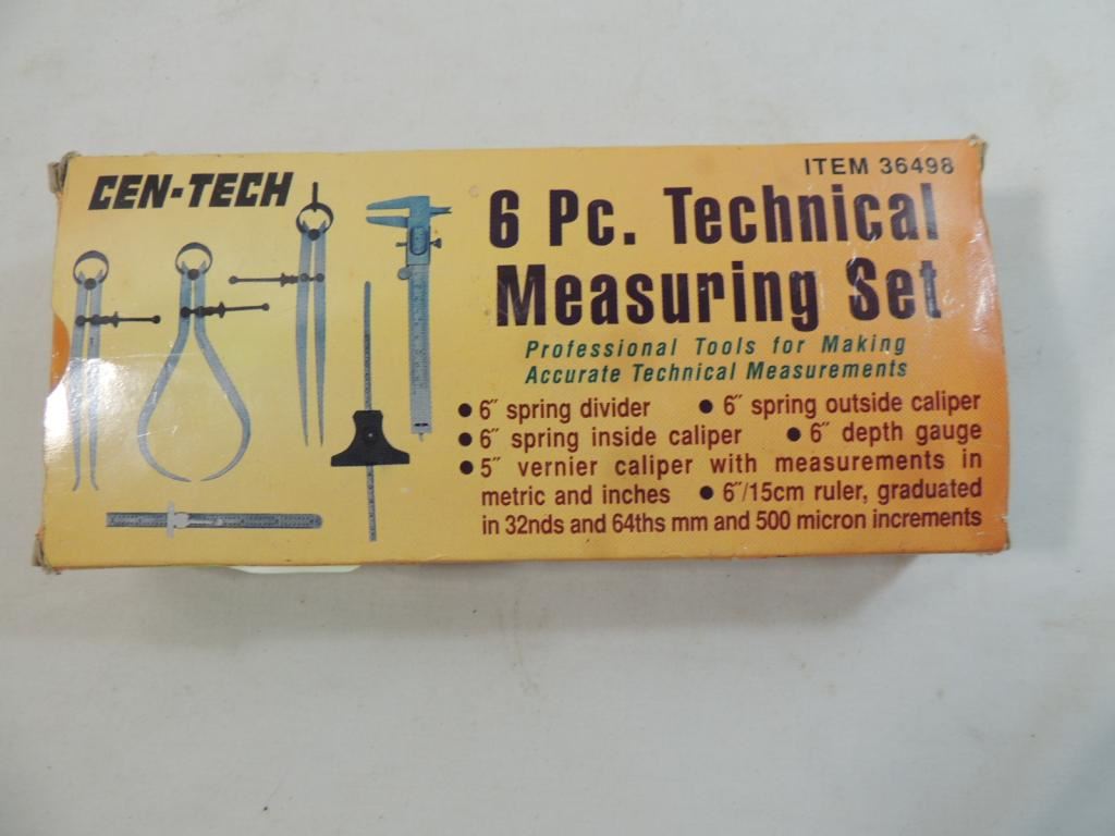 PROFESSIONAL TOOOLS FOR MAKING ACCURATE TECHNICAL MEASUREMENTS 6'" SPRING DIVIDER 6" SPRING OUTSIDE CALIPER 6" SPRING INSIDE CALIPER 6" DEPTH GAUGE 5" VERNIER CALIPER WITH MEASUREMENTS IN METRIC AND INCHES 6" 15CM RULLER AS SHOWN SEE PHOTO FOR MORE DETAILS.