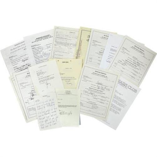<B>Various Correspondence From CENSORED Club.</B></I> From the files of the prominent show business club comes this packet with signed notes, letters and applications from a wide variety of entertainment an sports world celebrities: James Stewart (signed "Jimmy"), Milton Berle, Ernie Banks, Emilio Estevez, Tom Bosley, Richard Lewis, Buddy Ebsen (signed "Buddy"), Lainie Kazan (picture included), Norm Crosby, Fyvush Finkel, Pat Harrington and Norman Fell. Includes a handwritten note from Tom Bosley, offering to be a paying member rather than an honorary one, suggesting his honorary membership be offered "to someone who may not be as well-off financially as myself." Fascinating material in Excellent condition. <I>From the Beverly Hills CENSORED Club Celebrity Roast Archive.</B></I><BR><BR><b>Shipping:</b> Flat Material, Small (<a target="_blank" href="http://www.heritageauctions.com/common/shipping.php">view shipping information</a>)