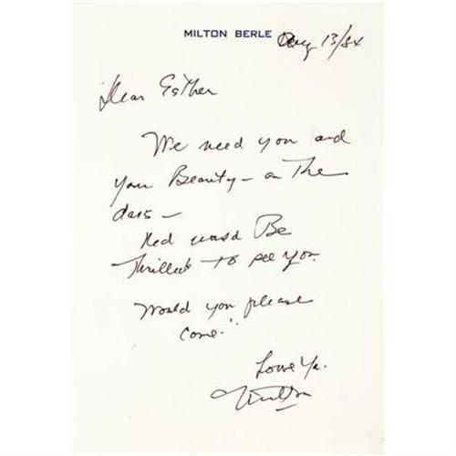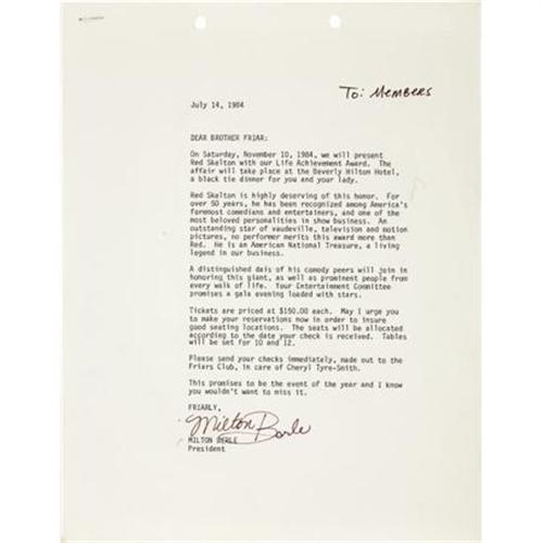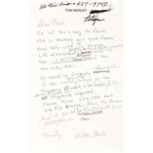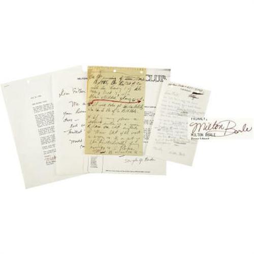 <B>CENSORED Club Comedian Correspondence.</B></I> This varied assortment of letters all relate to the private show business club's dinners honoring various fellow members. Included here: a hand-written letter to Esther Williams from Milton Berle (signed in black ink "Milton"), requesting she be on the dais for a dinner presenting a Life Achievement Award to Red Skelton; a form letter to the club members from Berle (signed in black ink "Milton Berle") regarding Skelton's black tie dinner; a note paper draft to Fred Astaire from Berle (signed in pencil "Milton Berle"), requesting that Astaire be chairman for a dinner honoring Gene Kelly; a two-page draft on note paper from Berle (initialed "M.B.") regarding a dinner for Dick Shawn; a photocopy of a letter to Gary Morton from Berle regarding a dinner for the Los Angeles Raiders; and a photocopy of a letter regarding a "roast" for sports entrepreneur Jerry Buss. Years covered are 1984 and 1985. Very Good condition. <I>From the Beverly Hills CENSORED Club Celebrity Roast Archive.</B></I><BR><BR><b>Shipping:</b> Flat Material, Small (<a target="_blank" href="http://www.heritageauctions.com/common/shipping.php">view shipping information</a>)