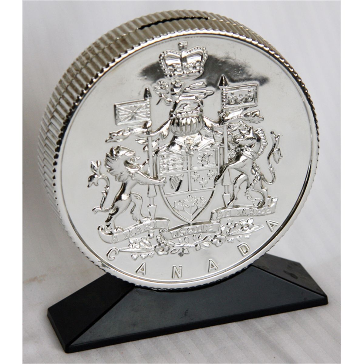 CENTENNIAL BANK, 1967. ‘CREDIT UNIONS ARE GROWING IN CANADA’. Coin shape/on base. Coin slot on top. 14 1/2cm high. Silver coloured plastic, base black. VF.