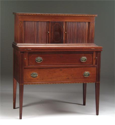CENTENNIAL INLAID TAMBOUR LADIES SECRETARY. In two sections with tambour slides, central door with line inlay. Bottom section with fold over writing surface which need new covering, two drawers, raised on tapered square legs with line inlay. Old original surface. SIZE: 43-3/4in. h x 36in. w x 18in. d. CONDITION: Generally good, shows some use. 9-26215
