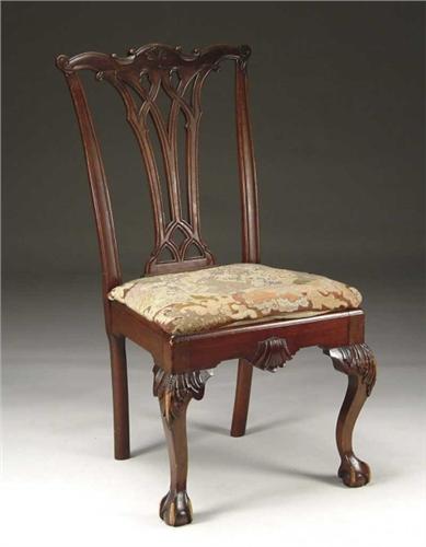 CENTENNIAL PHILADELPHIA STYLE CHIPPENDALE SIDE CHAIR. Pierced and carved back splat with scroll carved crest having leaf carving. Front apron with shell carving, ball and claw foot with cabriole legs with finely carved knees. Presently has griffin decorated needlework seat. SIZE: 39-1/2” h x 18” seat h. CONDITION: Some repairs, scuffing to front leg carving. 9-27020