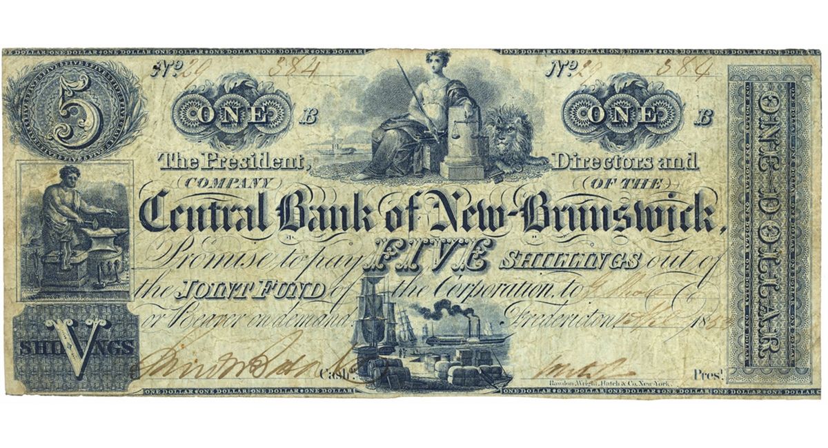 Five Shillings. $1.00. April 1, 1853. CH-95-10-06-02. No. 29.384/B. Blue face and brown latchwork back. Signed Babbitt/Botsford. Fine/VF. Pin hole at upper left corner. Ex. JHA Sale, Oct., 1990.