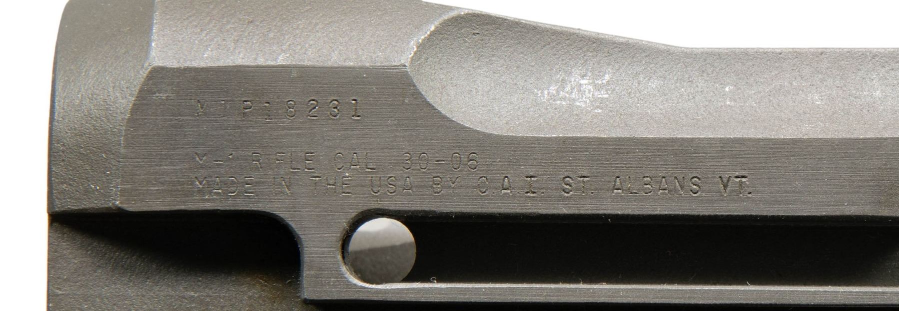 S# M1P18231. Investment cast receiver contains no additional parts. Receiver is marked on the left forward end "M-1 RIFLE CAL 30-06 / MADE IN THE USA BY C.A.I. ST. ALBANS VT.". Receiver finish appears to be a gray parkerization. CONDITION: receiver has not been fitted to rifle & displays a somewhat rough finish. (25-3123/RW). MODERN. $50-100.