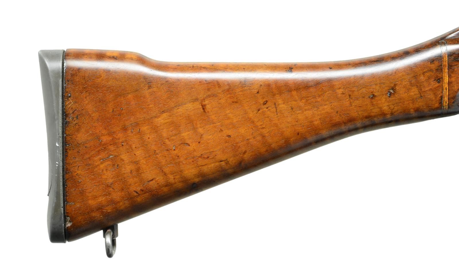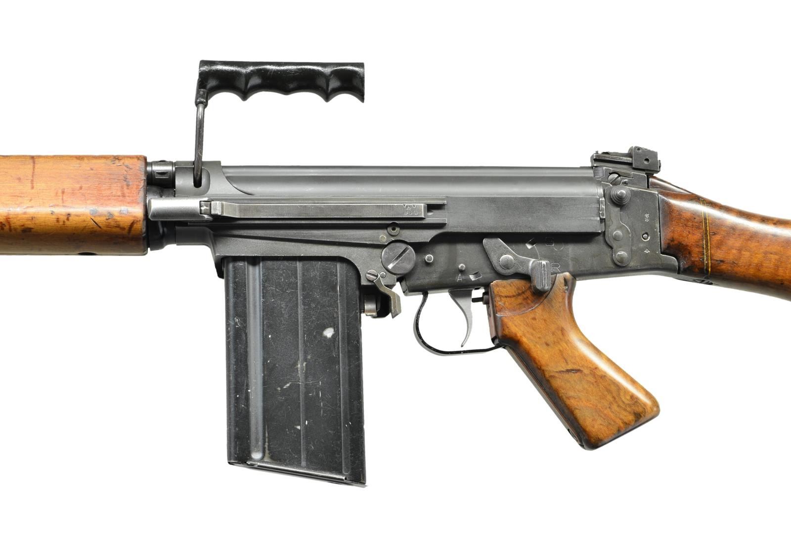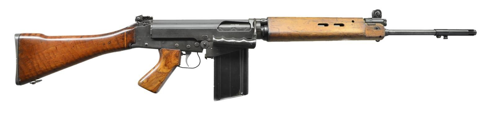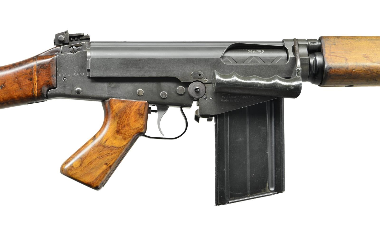 Cal.308 S#01-02343 Bbl.22.5" over brake. Century Arms, Inc R1A1 variant of the popular FAL, nicknamed “The Right Arm of the Free World”. Parkerized receivers. Inch pattern. 11" wood handguard w/ ventilation slots and holes. Wood pistol grip and buttstock, w/ steel, trap door butt plate. Sling swivels front and rear. Protected post front sight along w/ rear peep sight adj. in elevation from 200-600 yards. Folding, black plastic carry handle. Lower receiver safety / selector marked "S-R-A" on left, & "AD6415695" on right. Right side upper receiver markings "CENTURY ARMS INC. / GEORGIA, VT / R1A1 SPORTER 308 CAL / MADE IN USA". Left side non-reciprocating charging handle. MAGS: 1 steel, 20rd Inch Pattern. CONDITION: Parkerized finish on exposed metal surfaces is complete and consistent with some thinning on high spots and in areas of mechanical intervention. Wood shoulder stock is a beautiful natural tiger stripe pattern w/ 2 custom inlets, an inch rear of the receiver. Only a few light impressions at the rear. Matching pistol grip is also a gorgeous specimen also retaining a few small impressions. Front handguards match well in color, though appear a little more traditional, with typical armory earned dings, scratches and impressions associated with use and rack wear. Bolt and carrier marked "6801426" in electric pencil. Bore is bright with strong rifling. Fire control mechanism appears to function correctly when cycled by hand. (22-2372/JZ). MODERN. $1,200-1,800
