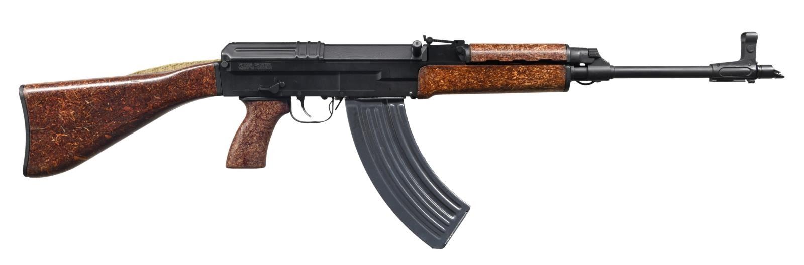Cal. 7.62x39mm. S# VZ08PM-000309. Bbl. 16.5". Century Arms International variant of the semiautomatic Czechoslovakian VZ-58 rifle. Milled receiver. Dark black matte finish. Right hand threaded barrel terminated w/ Chinese style slanted muzzle brake. Protected post front sight w/ intact bayonet lug. Tangent rear sight adjustable to 800 meters. Left side sling swivels currently sporting tan canvas & leather sling. Right side safety / selector. Correct brown bakelite furniture. MAGS: 2 aluminum 30 rd. CONDITION: finish is complete & consistent w/ very little external sign of use. Furniture free of any visible imperfections. Bore is bright w/ strong rifling. Fire control mechanism appears to function correctly when cycled by hand. (23-2075/JZ). MODERN. $500-900.