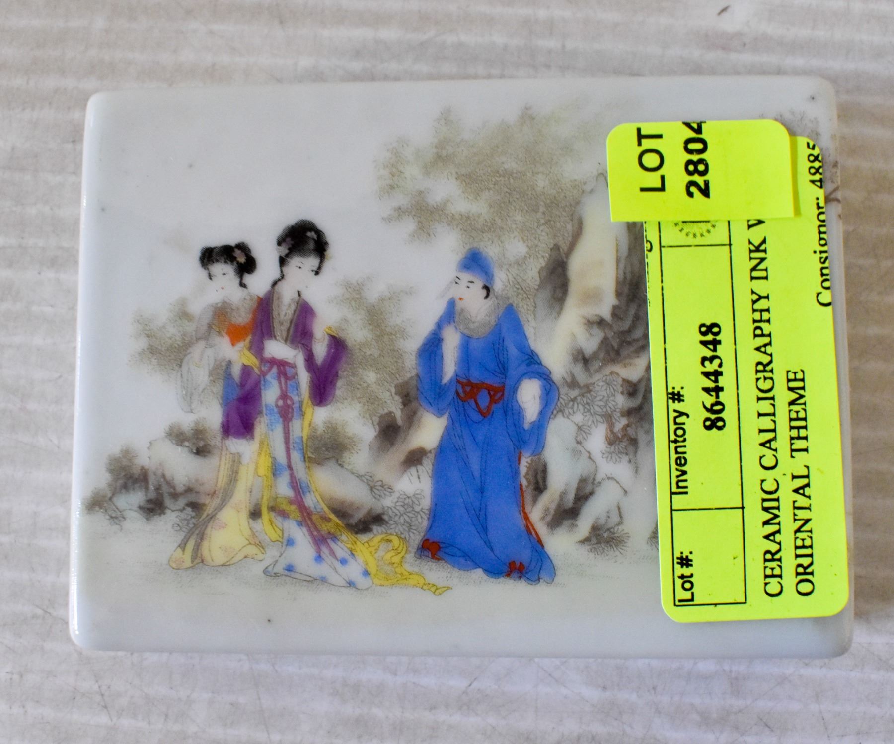 VINTAGE CALLIGRAPHY INK WELL WITH ORIENTAL THEME 3 X 4 X 1 INCHES