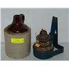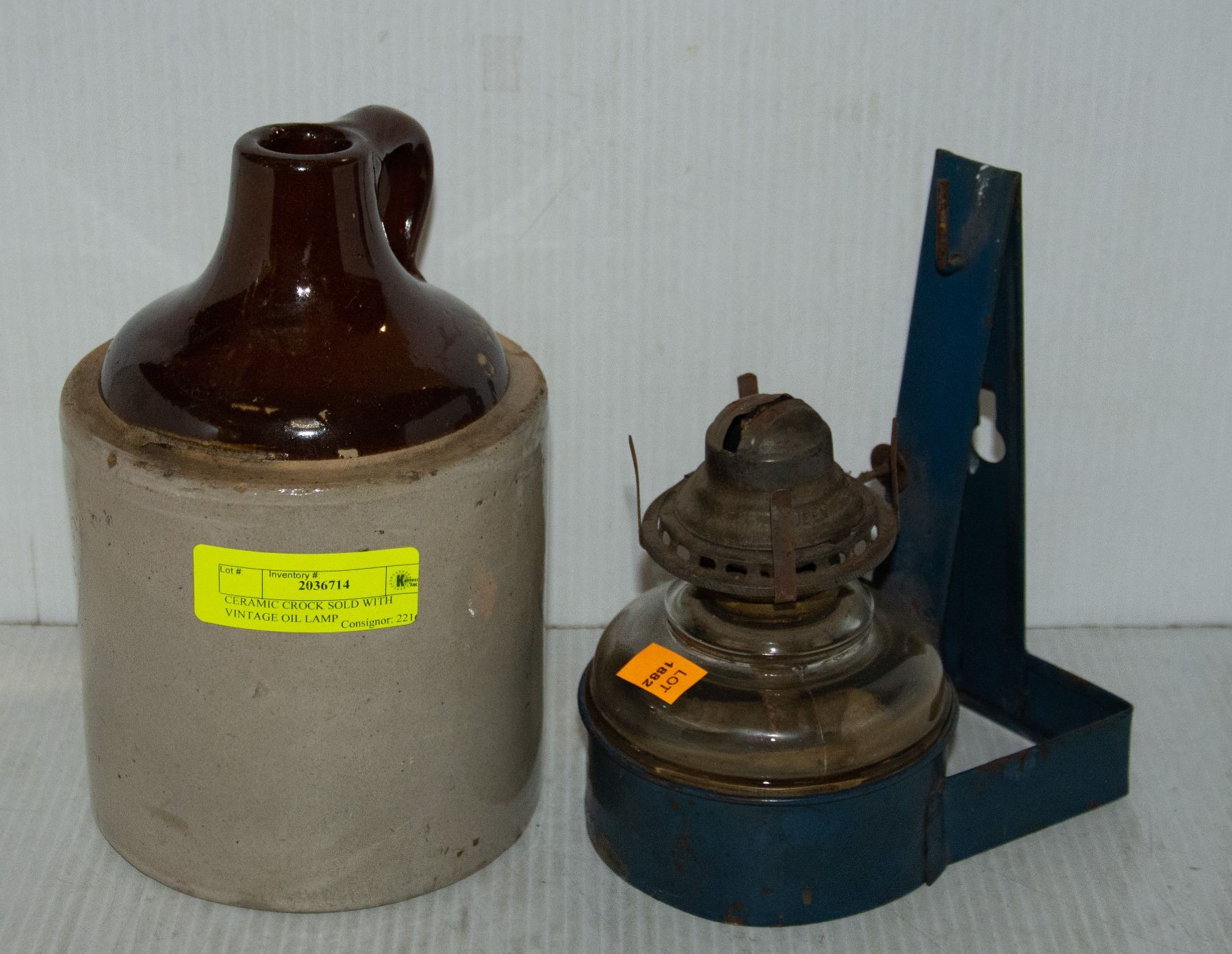 CERAMIC CROCK SOLD WITH VINTAGE OIL LAMP