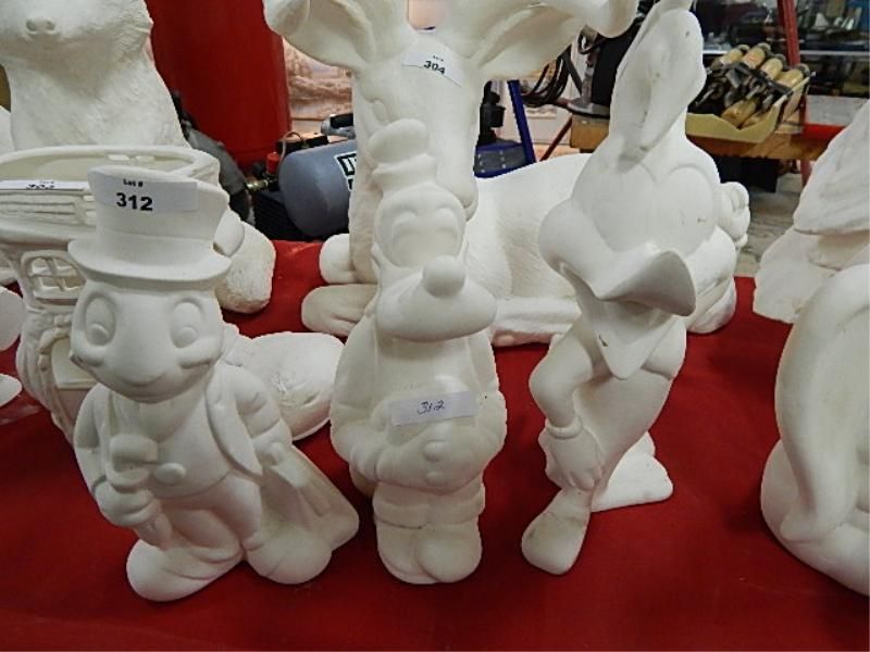 CERAMIC FIGURES - UNFINISHED - JIMMENY CRICKET, GOOFY, & WOODY WOOD PECKER = 3