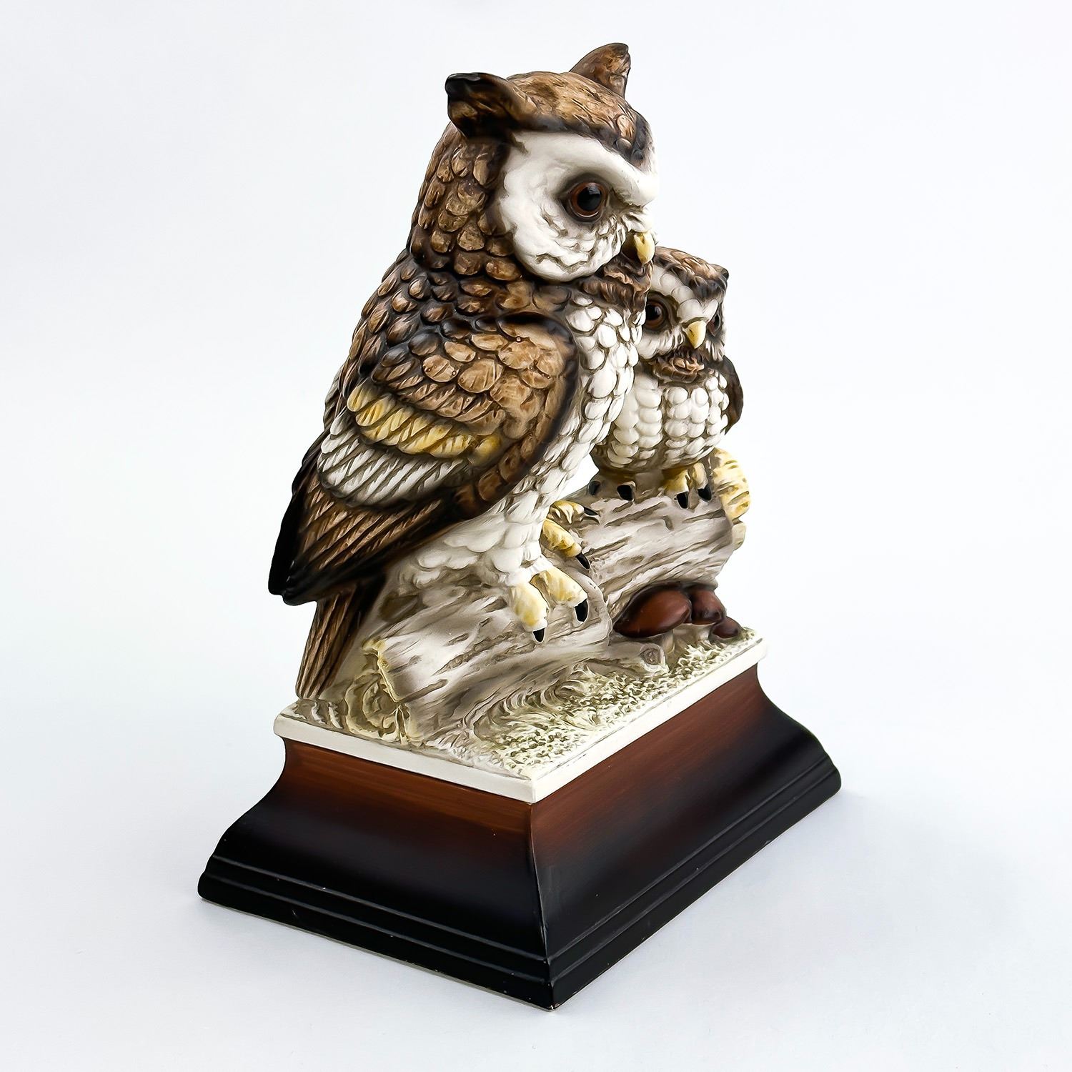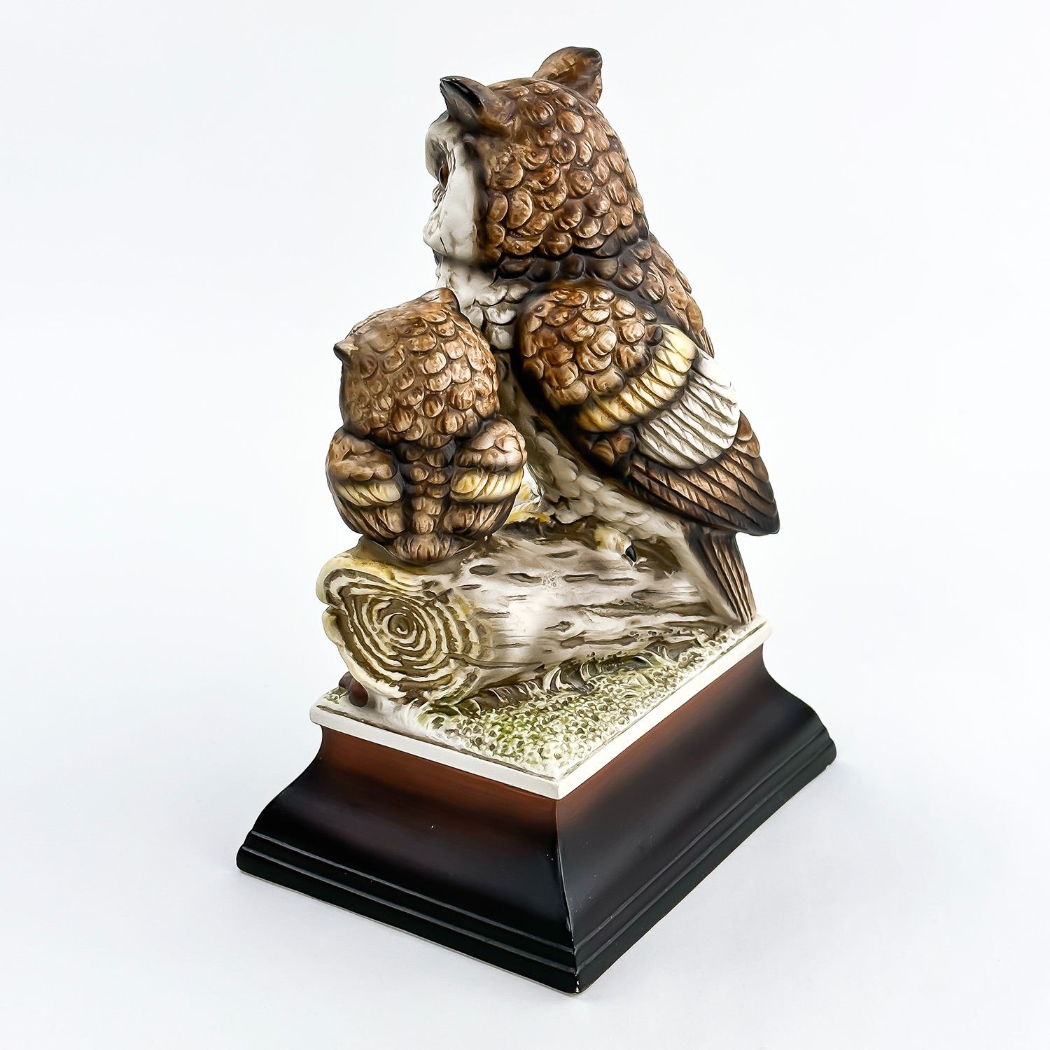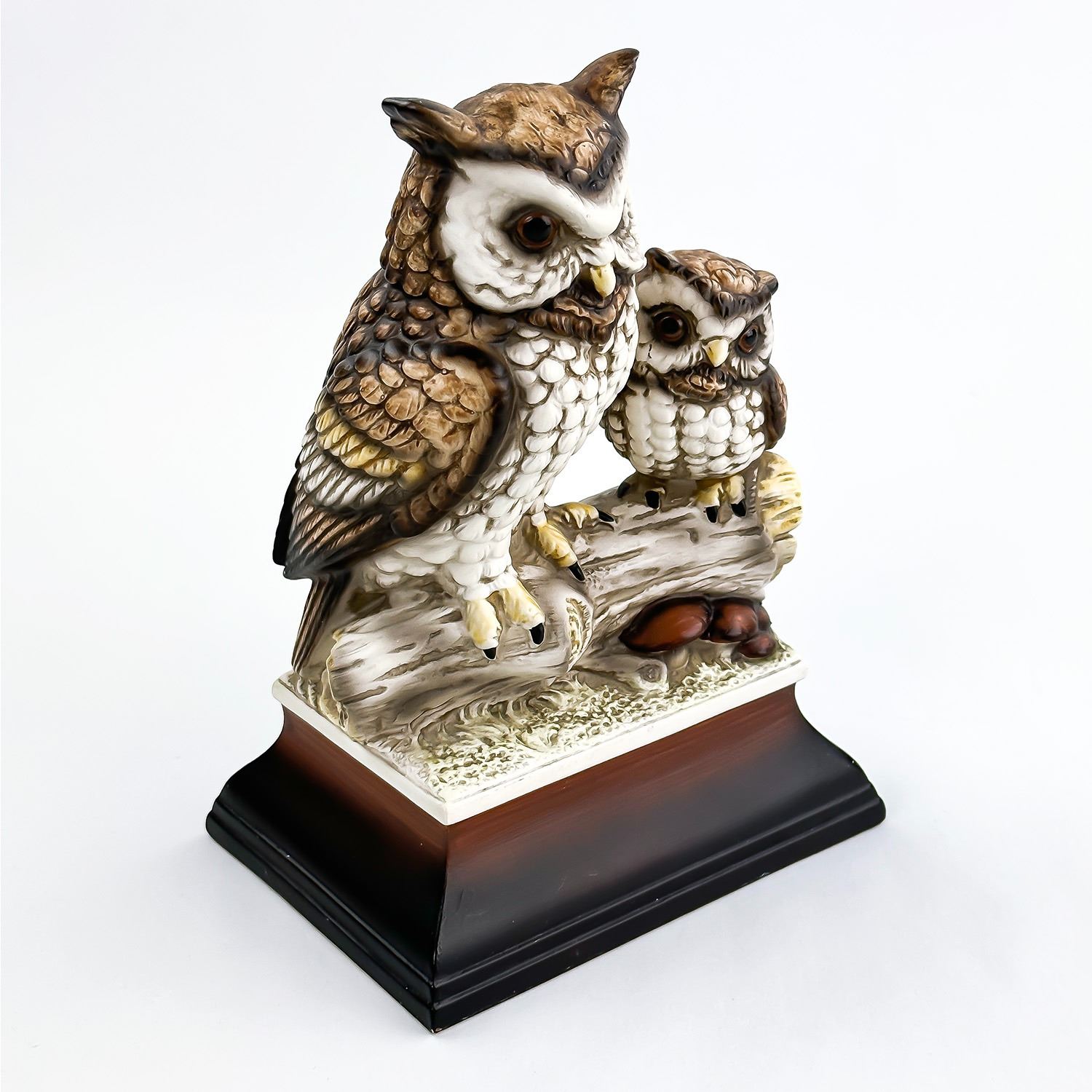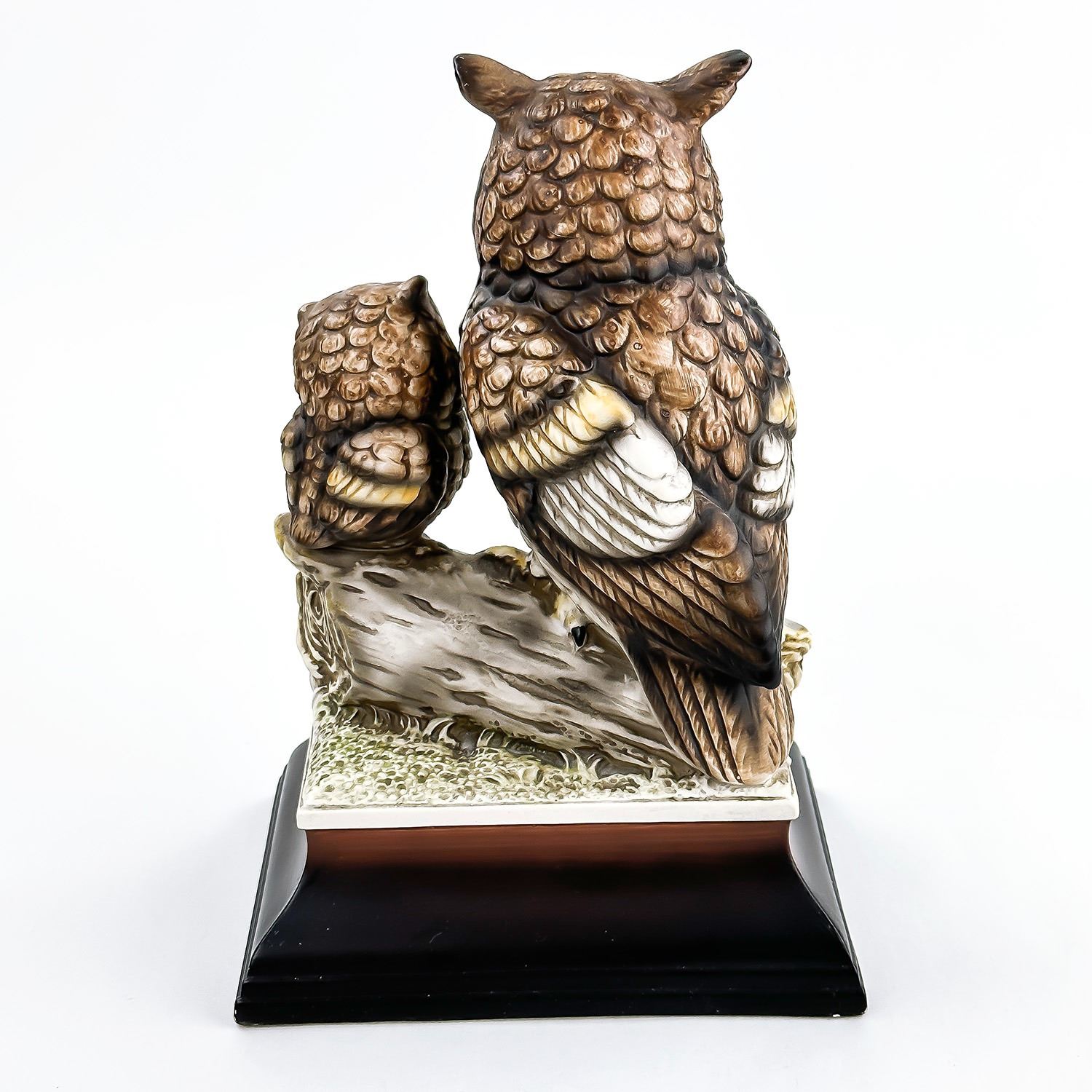 #8363 - VINTAGE PAIR OF HORNED OWLS ON A LOG FIGURINE. MEASURES: 8” (20 CM) TALL BY 5.5” (14 CM) WIDE AND 4” (10 CM) DEEP