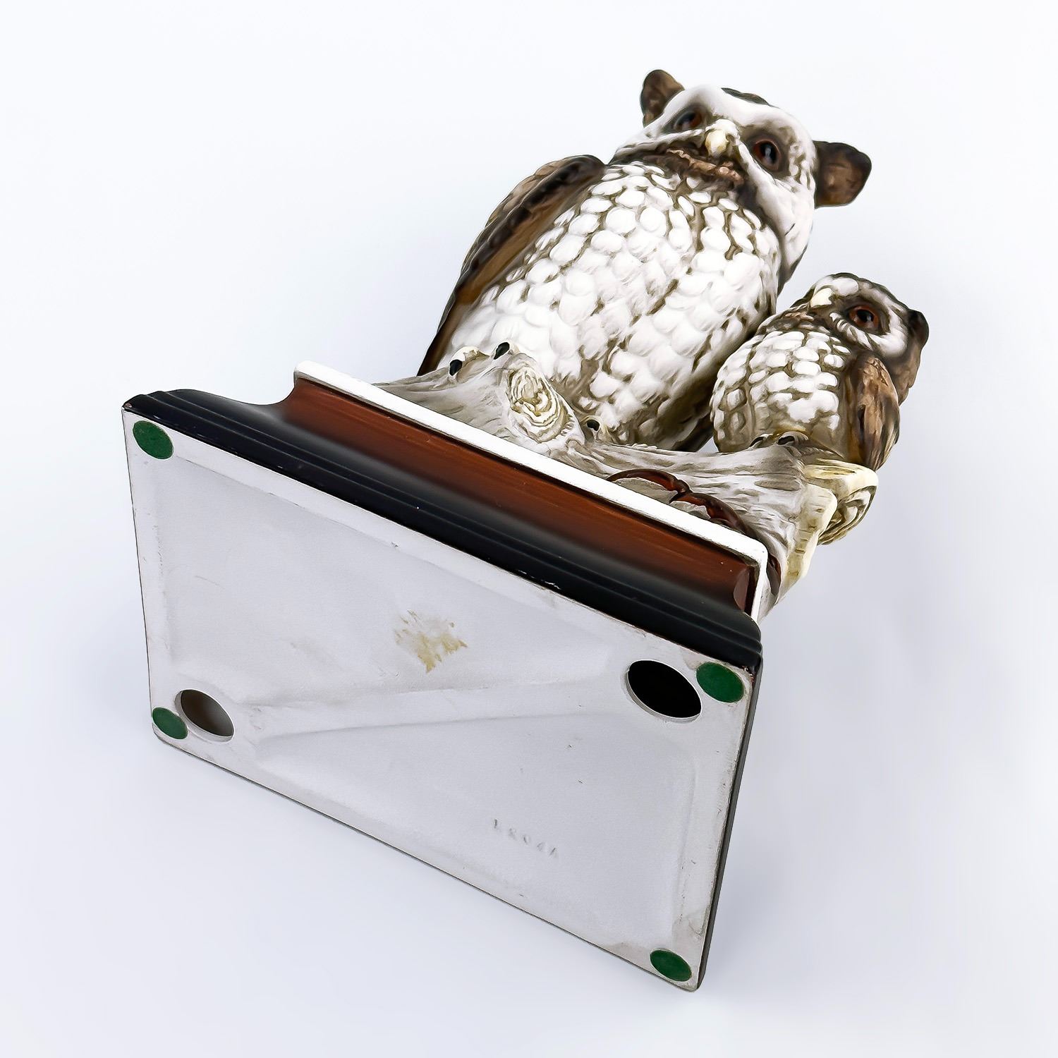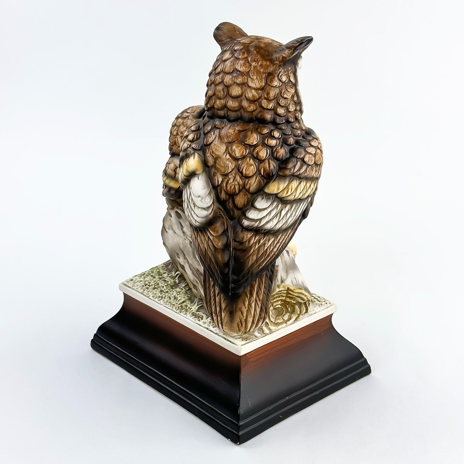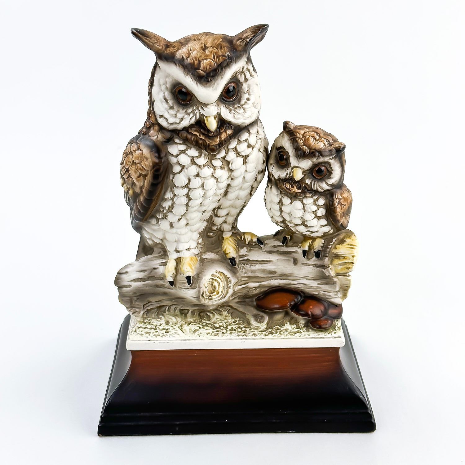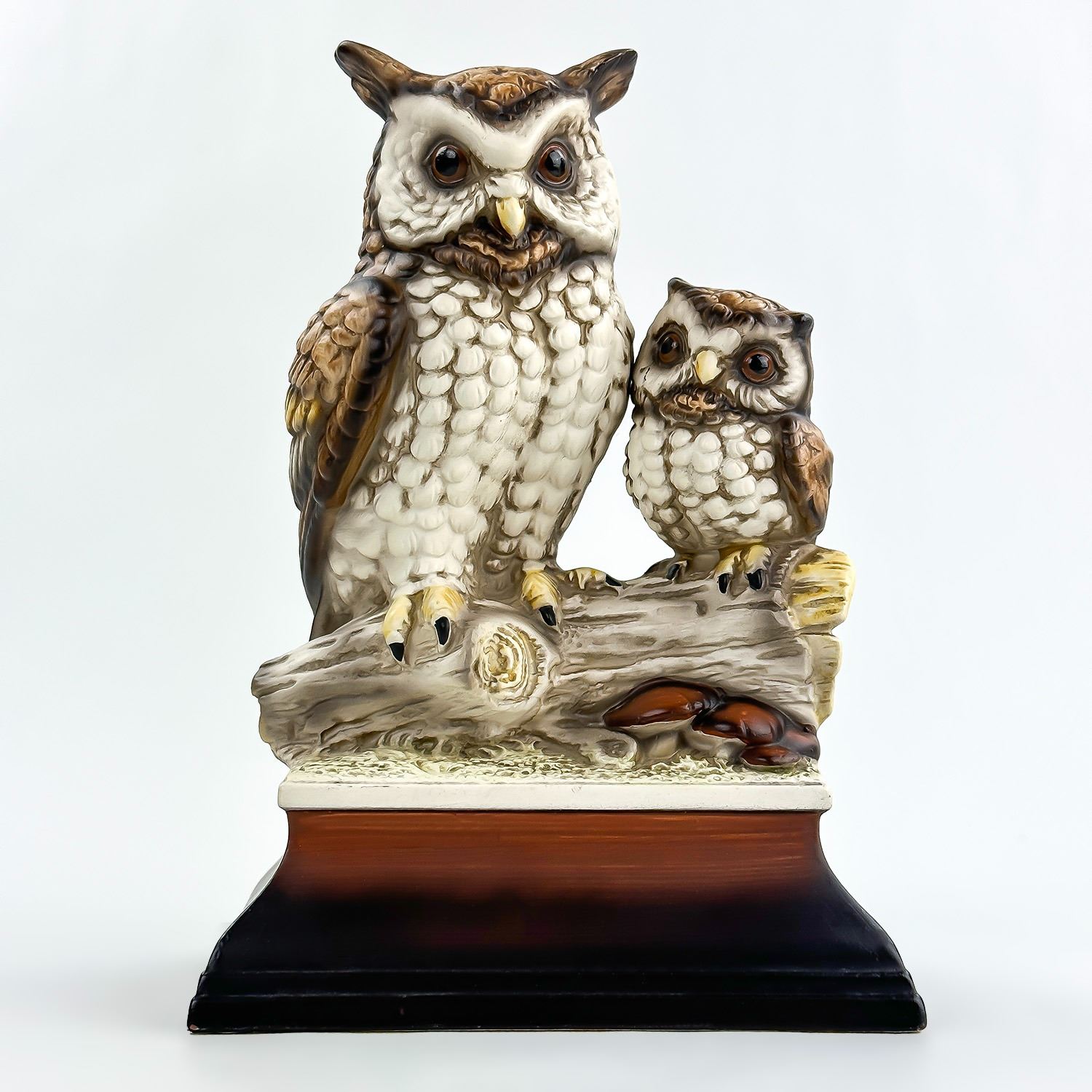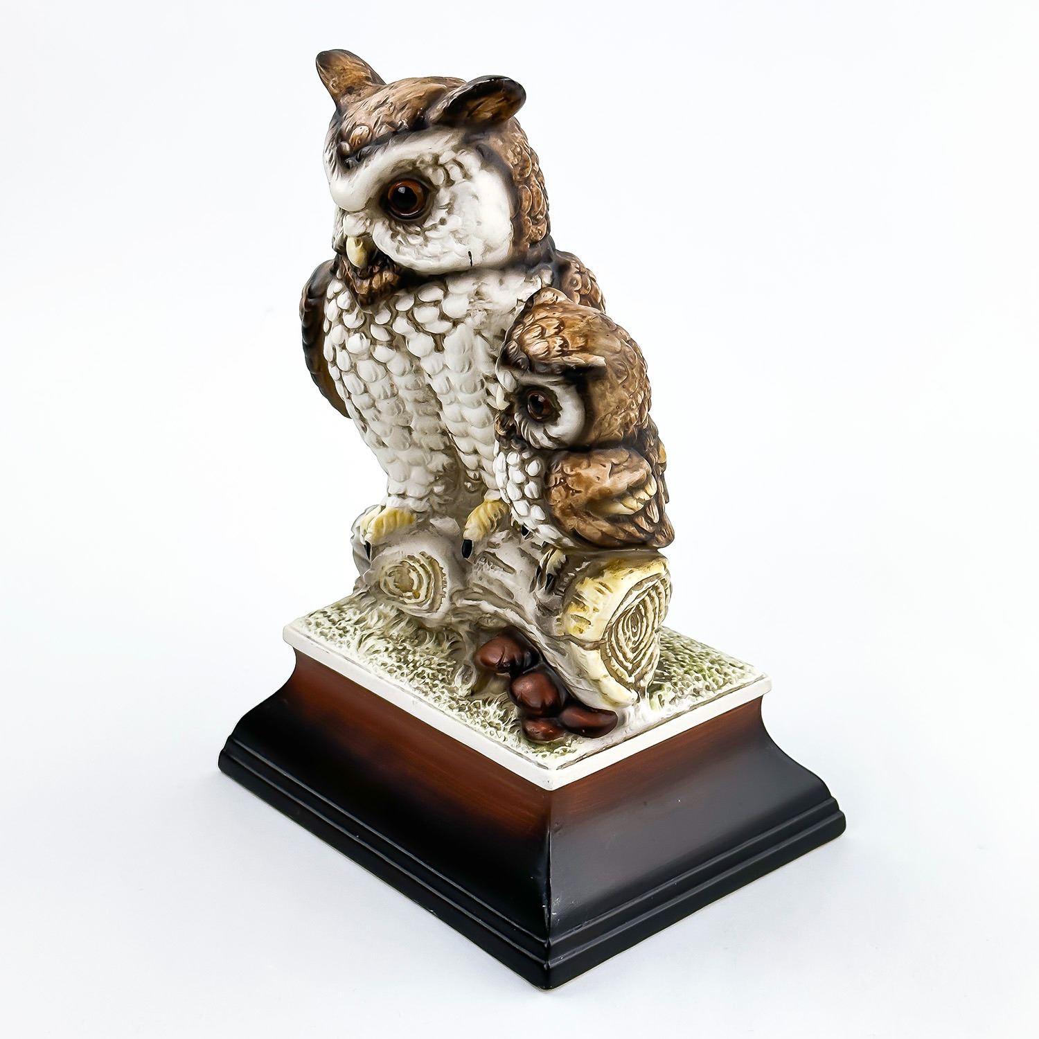 #8363 - VINTAGE PAIR OF HORNED OWLS ON A LOG FIGURINE. MEASURES: 8” (20 CM) TALL BY 5.5” (14 CM) WIDE AND 4” (10 CM) DEEP