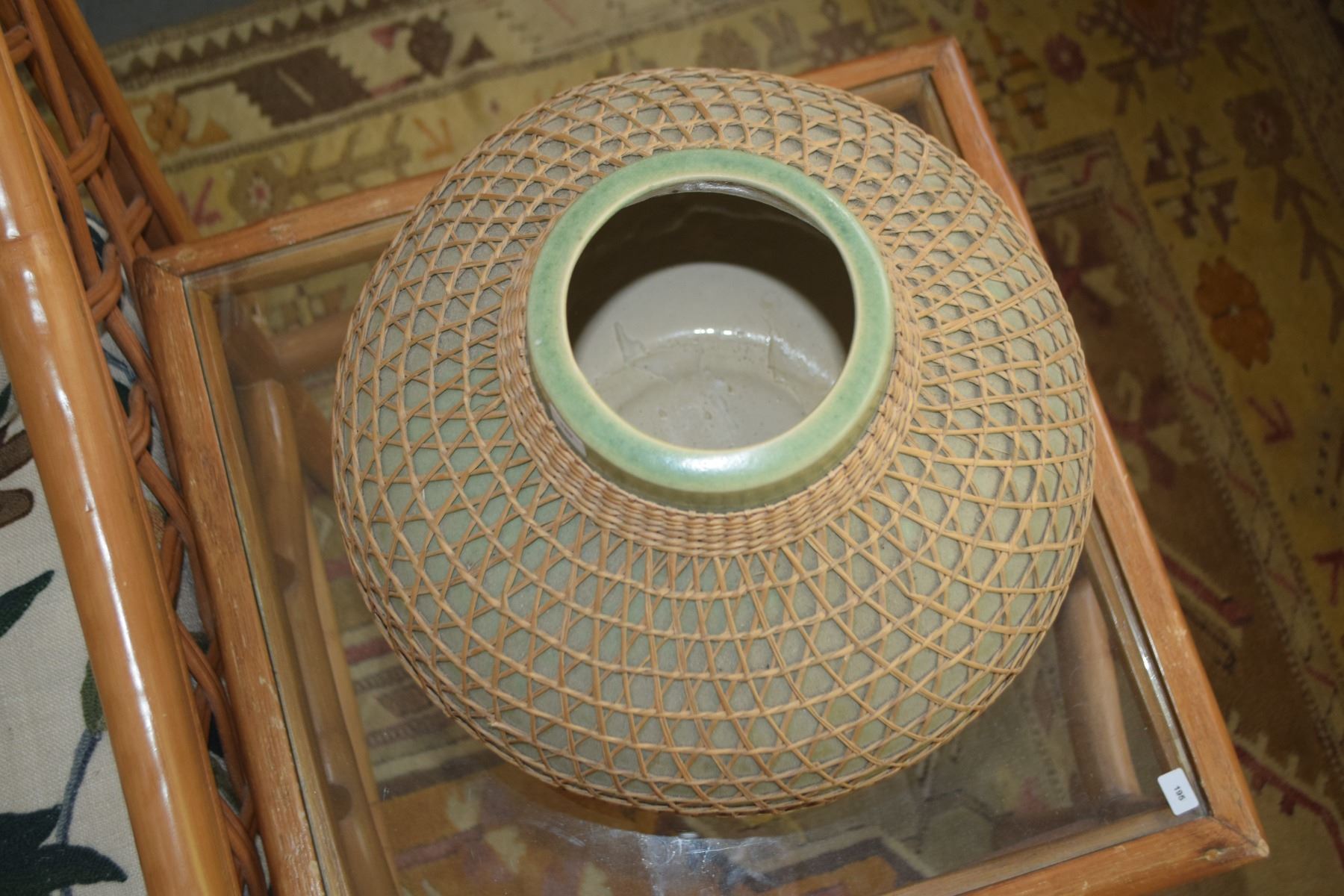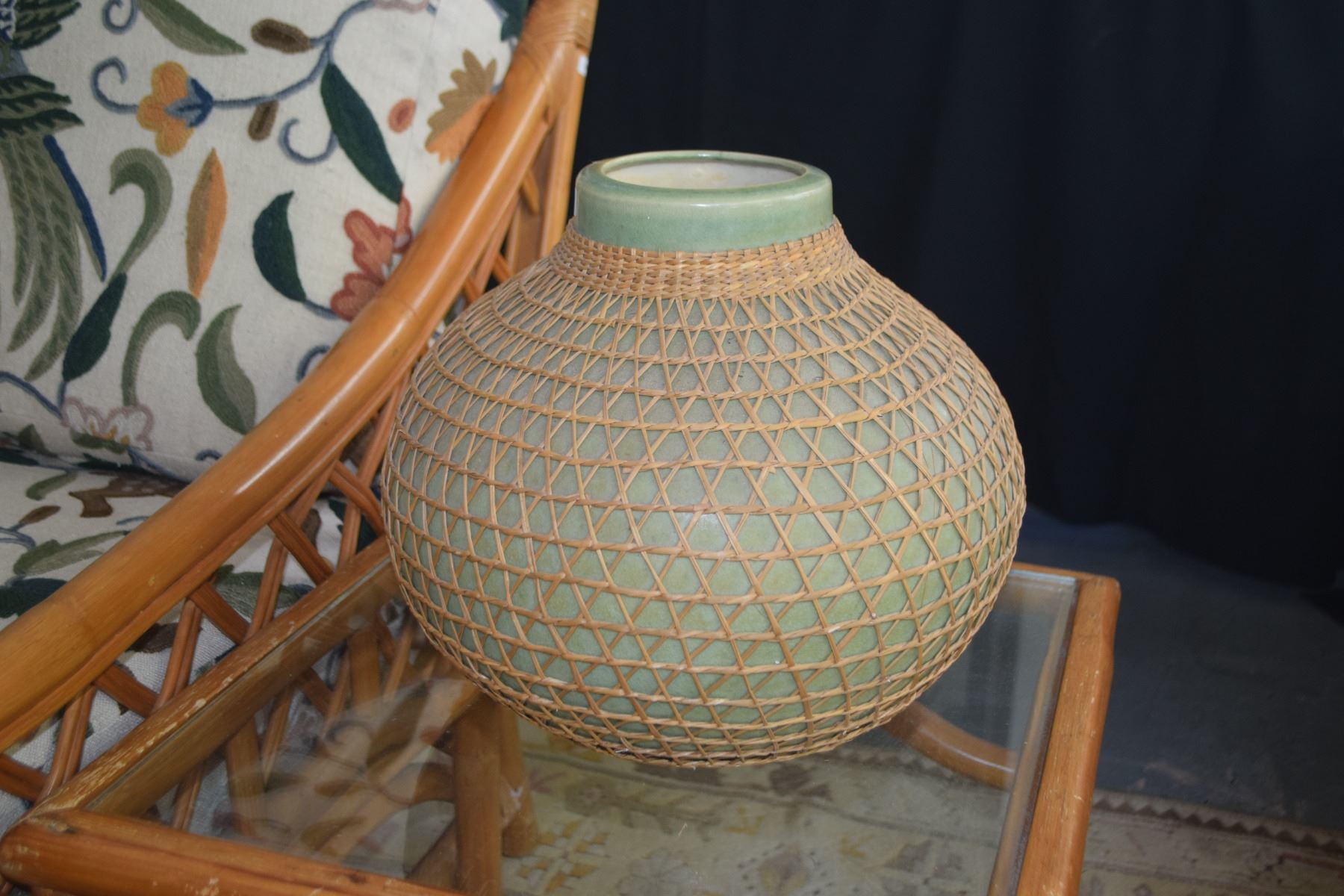 CERAMIC POT W/LATTICED WOVEN STRAW OVERLAY