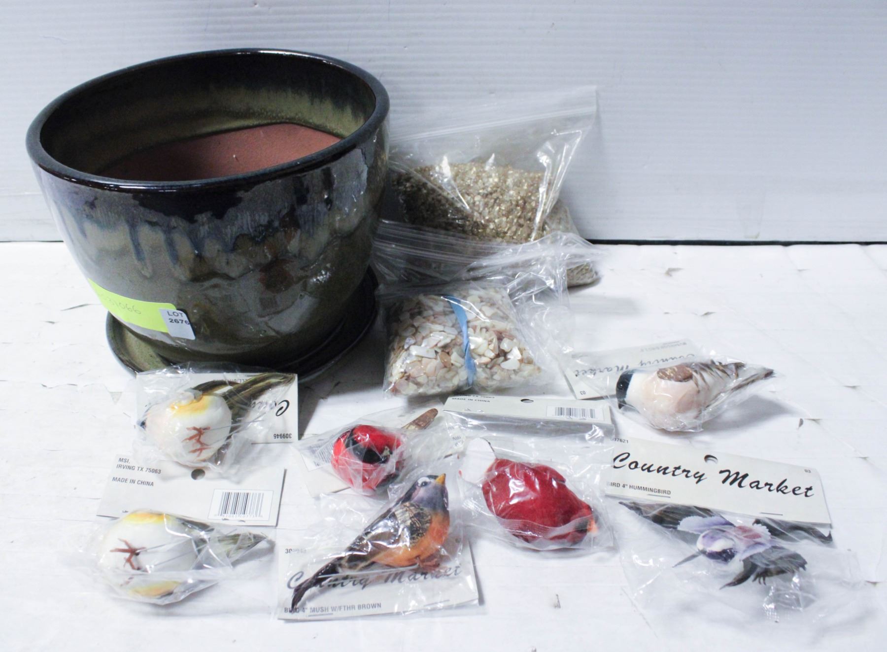 CERAMIC POT WITH FANCY ROCKS & BIRDS - ESTATE