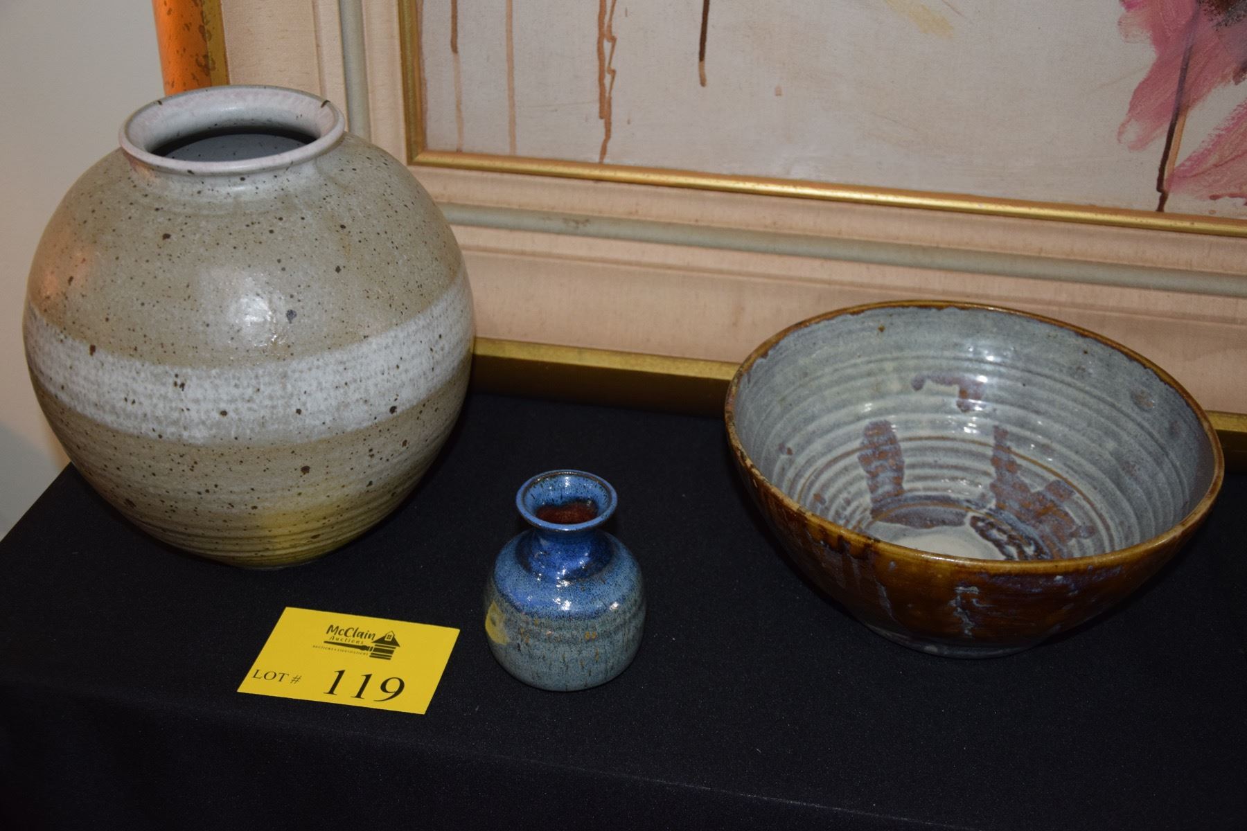 CERAMIC POTS & BOWL; SIGNED (3 PCS)