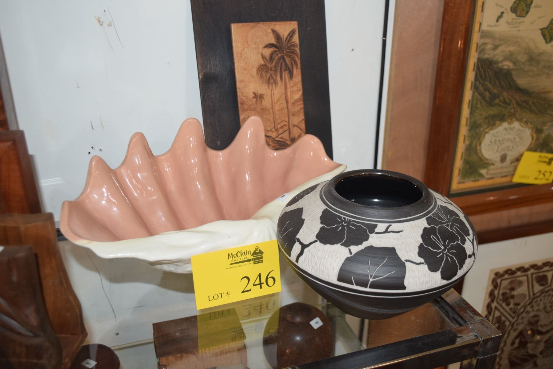 CERAMIC VASE; SIGNED LEROY TABA, HAWAII, CERAMIC CLAM SHELL & ETCHED WOOD PANEL (PALM TREES) (3 PCS)