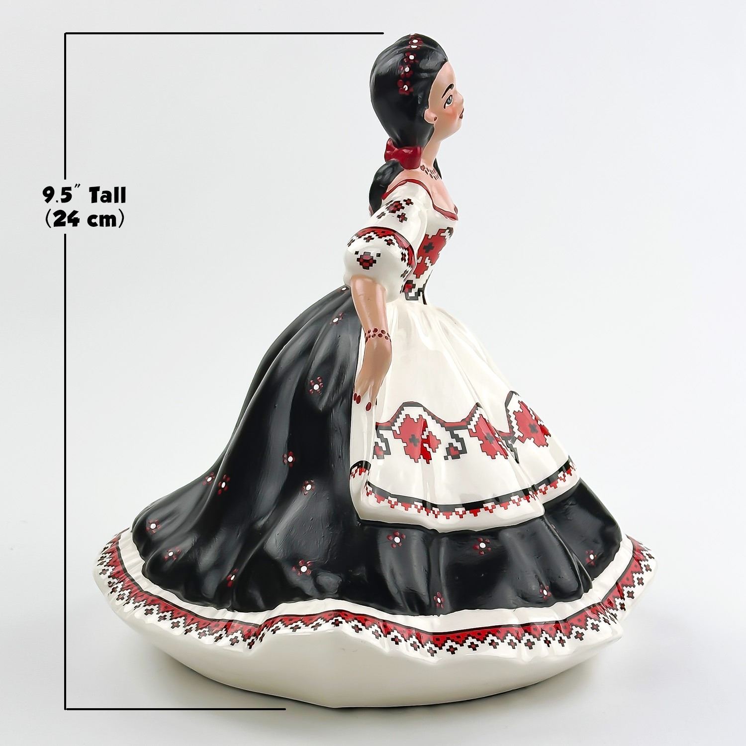 #8071 - HAND CRAFTED VINTAGE UKRAINIAN CERAMIC ART - WOMAN FIGURINE WITH UKRAINIAN EMBROIDERY MOTIF DRESS. HOME DECOR. MEASURES: 9.5”(24 CM) TALL BY 9.5” (24 CM) WIDE