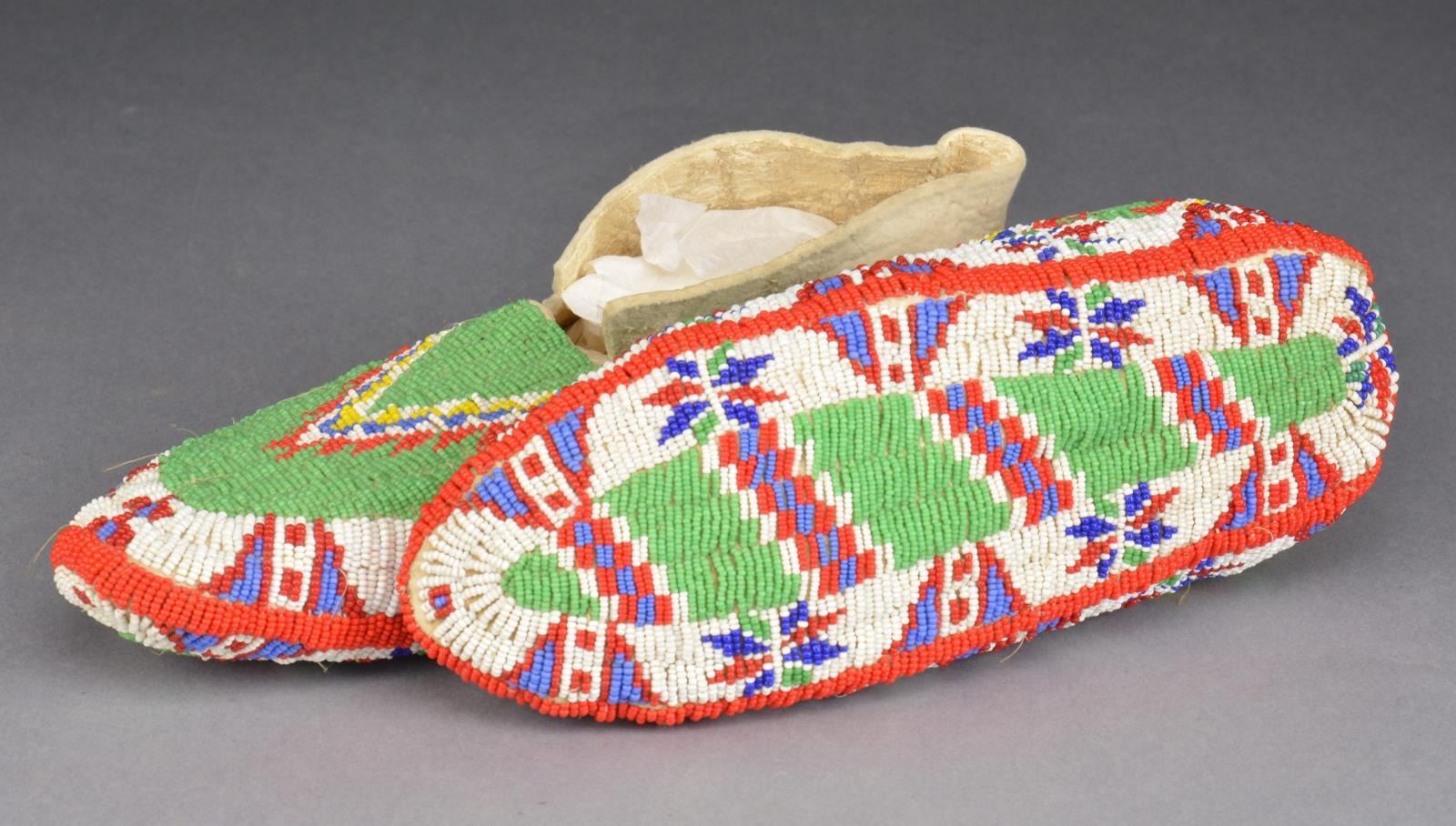 9.5" Long, fully beaded including soles. Uppers multicolored geometric design on green ground. Soles multicolored geometric design on green/white ground. 20th Century. CONDITION: very fine overall, complete & supple. (02-14585/JS). $1,500-2,500.