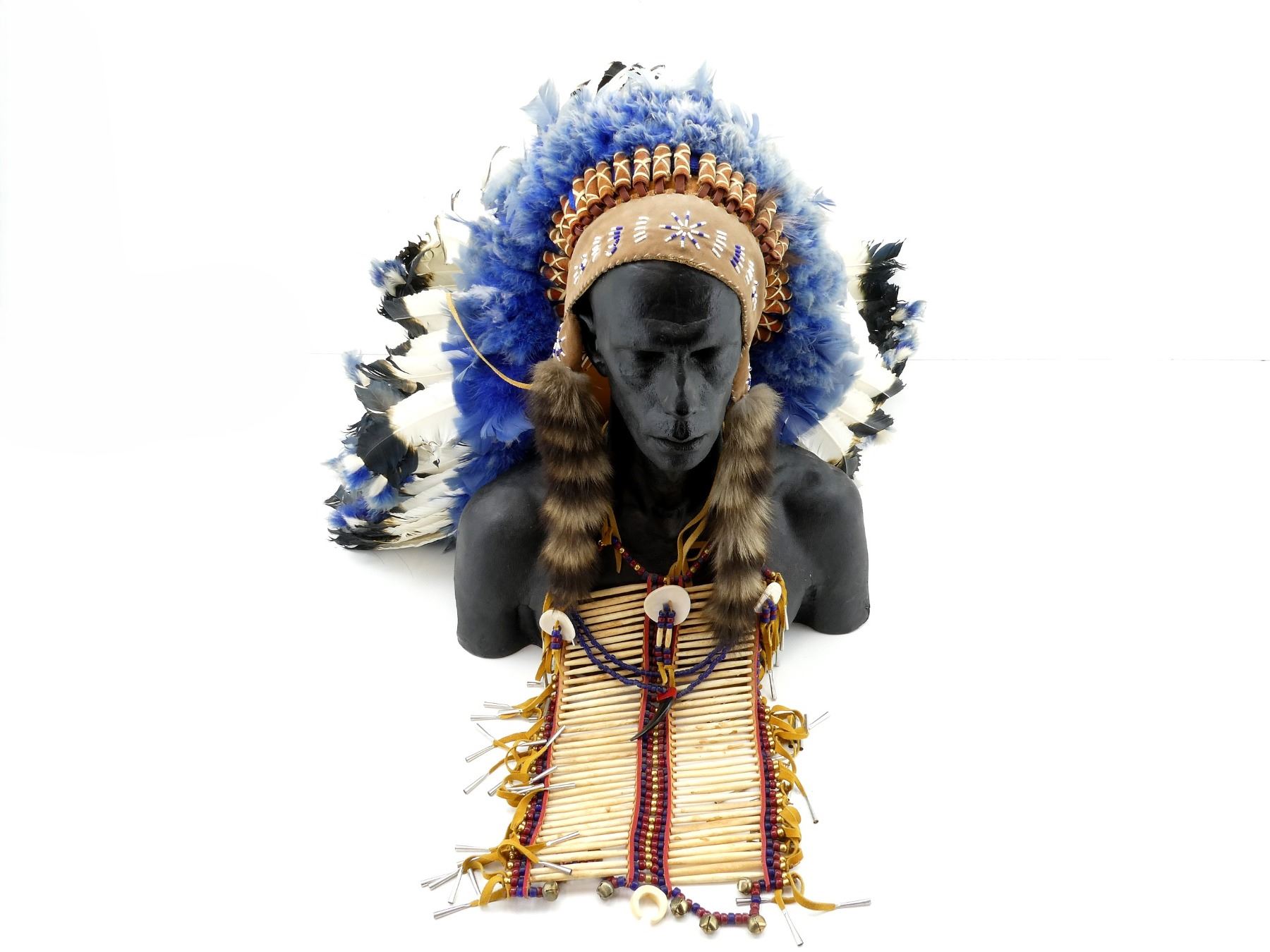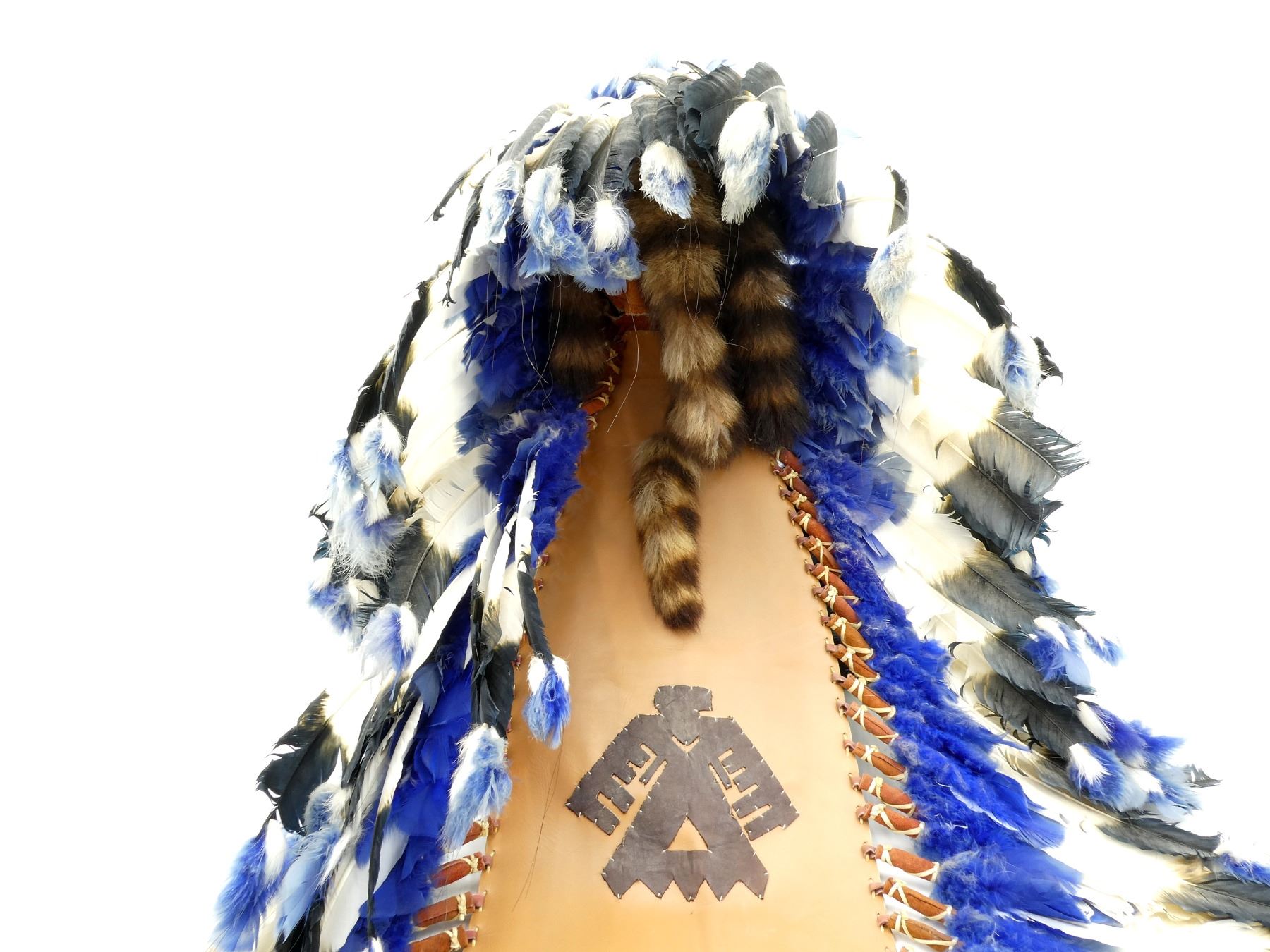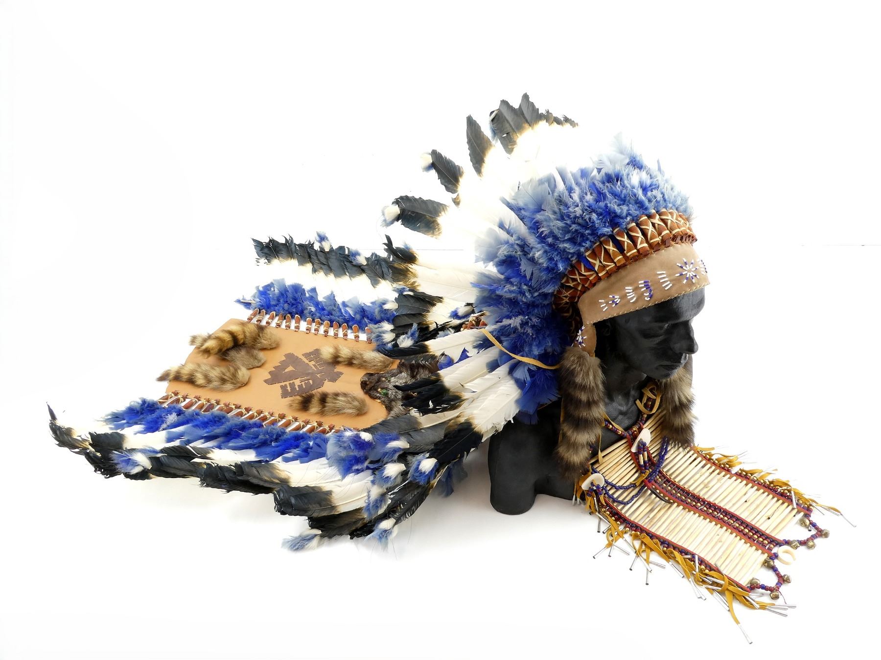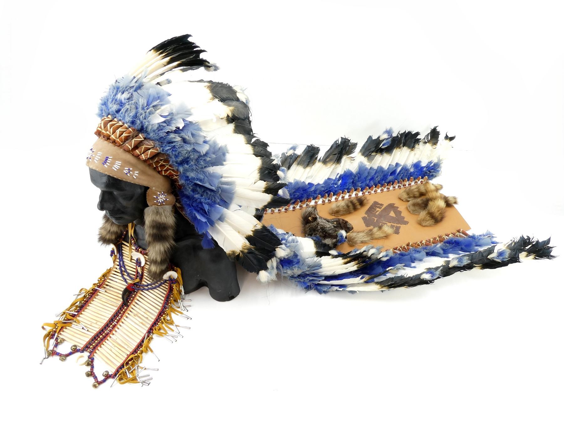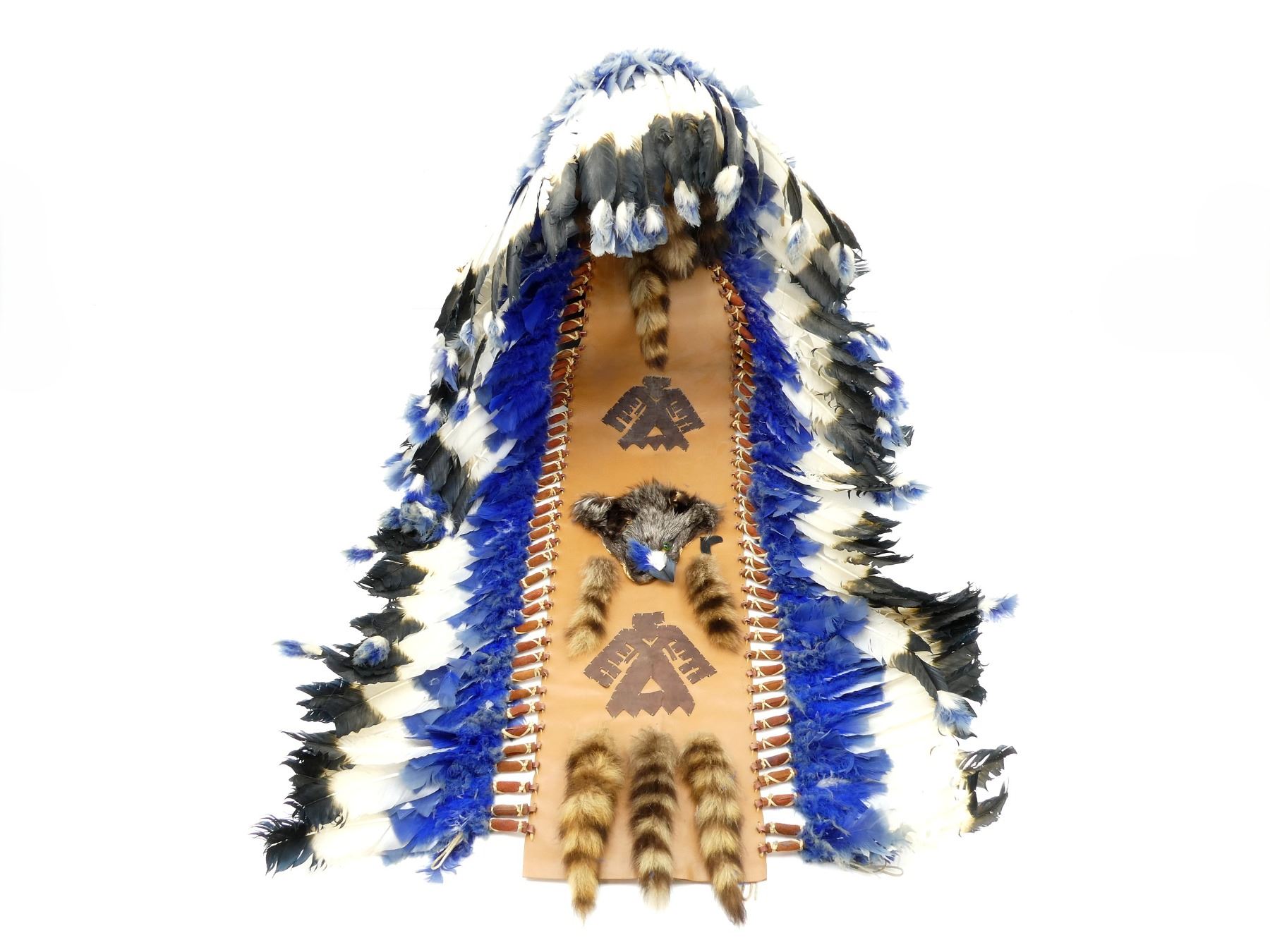 LOT INCLUDES; (1) HEADDRESS, LEATHER, FEATHER & BEAD CONSTRUCTION, INTRICATE BEAD WORK, FOX FACE PELT & RACCOON TAIL ACCENTS, ADORNED WITH POSSIBLE THUNDERBIRD SYMBOL, HEAD OVERALL LENGTH APPROX. 7" (HORIZONTAL) X 9" (VERTICAL) , TRAIN OVERALL LENGTH APPROX. 56.5" & (1) CHEST ARMOUR, BONE & BEAD CONSTRUCTION, LEATHER & METAL TASSELS, OVERALL LENGTH APPROX 22.5", ADJUSTABLE TIE STRAPS. SEE PHOTOS. * NO GUARANTEE ON MATERIAL FOR SHIPPING - EXTRA SHIPPING CHARGES WITH APPLY *